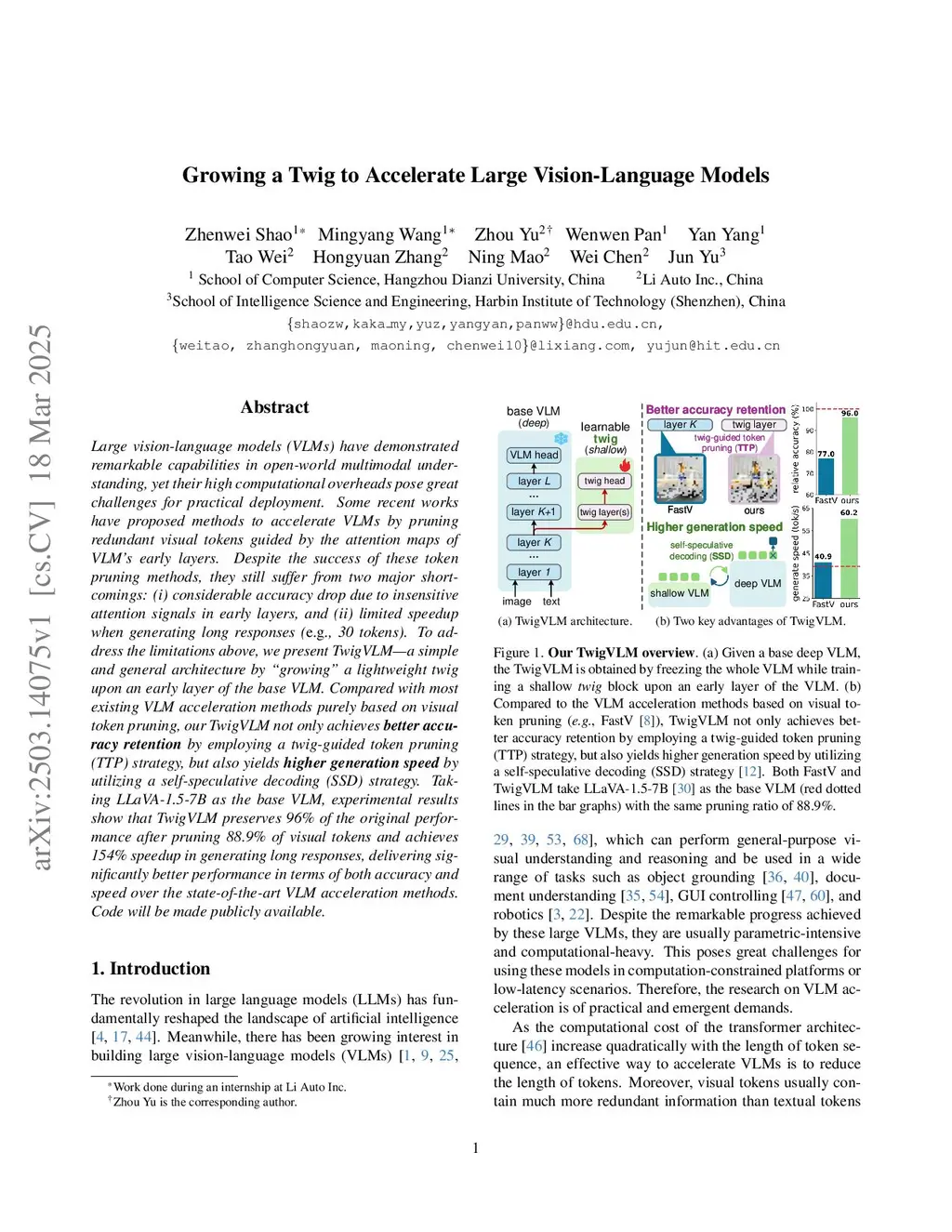 Large vision-language models (VLMs) have demonstrated remarkable capabilities in open-world multimodal understanding, yet their high computational overheads pose great challenges for practical deployment. Some recent works have proposed methods to accelerate VLMs by pruning redundant visual tokens guided by the attention maps of VLM's early layers. Despite the success of these token pruning methods, they still suffer from two major shortcomings: (i) considerable accuracy drop due to insensitive attention signals in early layers, and (ii) limited speedup when generating long responses (e.g., 30 tokens). To address the limitations above, we present TwigVLM -- a simple and general architecture by growing a lightweight twig upon an early layer of the base VLM. Compared with most existing VLM acceleration methods purely based on visual token pruning, our TwigVLM not only achieves better accuracy retention by employing a twig-guided token pruning (TTP) strategy, but also yields higher generation speed by utilizing a self-speculative decoding (SSD) strategy. Taking LLaVA-1.5-7B as the base VLM, experimental results show that TwigVLM preserves 96% of the original performance after pruning 88.9% of visual tokens and achieves 154% speedup in generating long responses, delivering significantly better performance in terms of both accuracy and speed over the state-of-the-art VLM acceleration methods.
