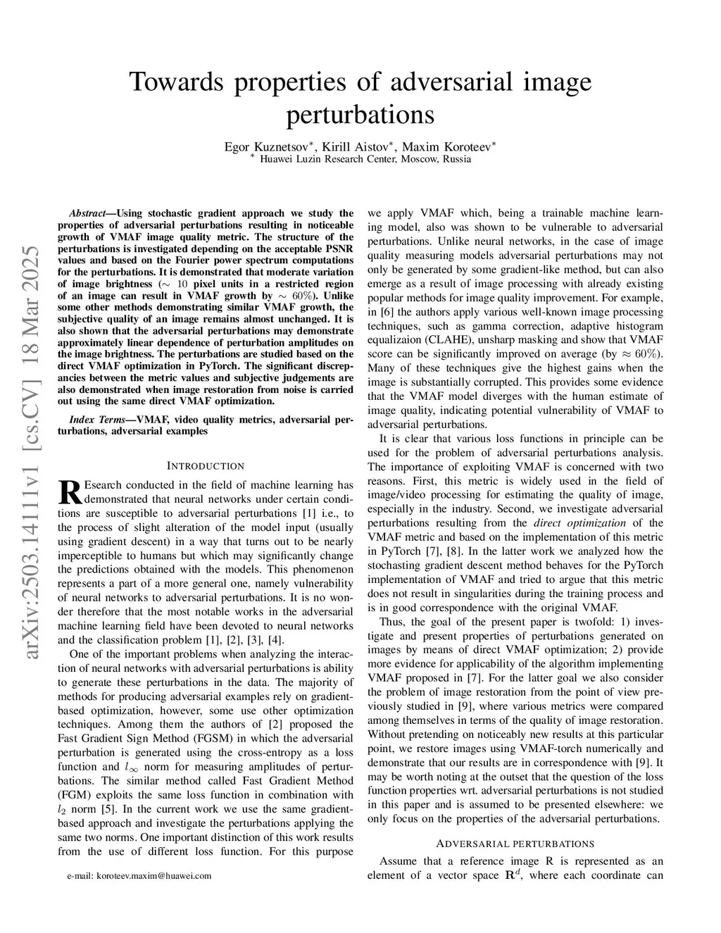 Towards properties of adversarial image perturbations