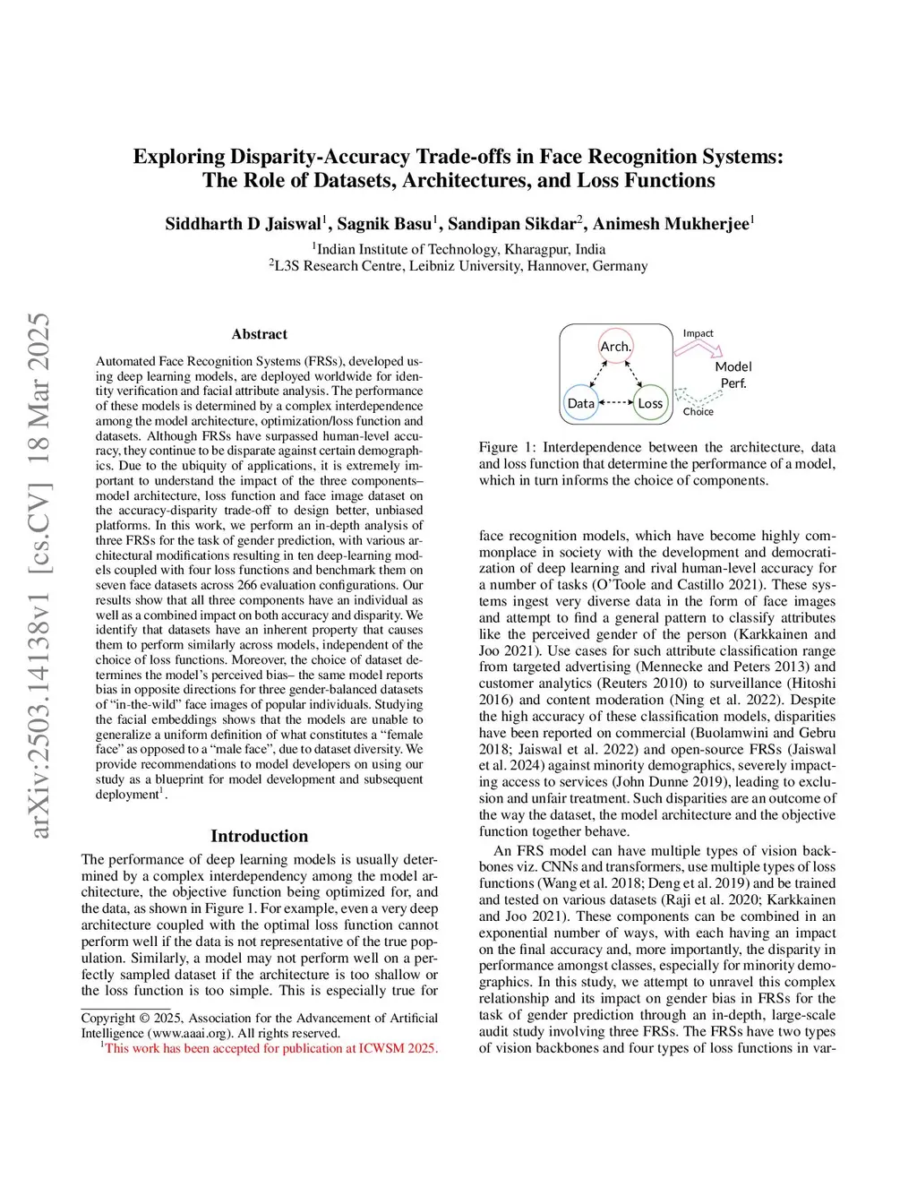 Automated Face Recognition Systems (FRSs), developed using deep learning models, are deployed worldwide for identity verification and facial attribute analysis. The performance of these models is determined by a complex interdependence among the model architecture, optimization/loss function and datasets. Although FRSs have surpassed human-level accuracy, they continue to be disparate against certain demographics. Due to the ubiquity of applications, it is extremely important to understand the impact of the three components -- model architecture, loss function and face image dataset on the accuracy-disparity trade-off to design better, unbiased platforms. In this work, we perform an in-depth analysis of three FRSs for the task of gender prediction, with various architectural modifications resulting in ten deep-learning models coupled with four loss functions and benchmark them on seven face datasets across 266 evaluation configurations. Our results show that all three components have an individual as well as a combined impact on both accuracy and disparity. We identify that datasets have an inherent property that causes them to perform similarly across models, independent of the choice of loss functions. Moreover, the choice of dataset determines the model's perceived bias -- the same model reports bias in opposite directions for three gender-balanced datasets of ``in-the-wild'' face images of popular individuals. Studying the facial embeddings shows that the models are unable to generalize a uniform definition of what constitutes a ``female face'' as opposed to a ``male face'', due to dataset diversity. We provide recommendations to model developers on using our study as a blueprint for model development and subsequent deployment.