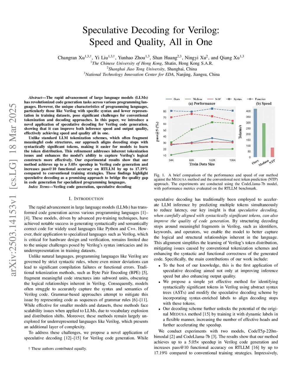 The rapid advancement of large language models (LLMs) has revolutionized code generation tasks across various programming languages. However, the unique characteristics of programming languages, particularly those like Verilog with specific syntax and lower representation in training datasets, pose significant challenges for conventional tokenization and decoding approaches. In this paper, we introduce a novel application of speculative decoding for Verilog code generation, showing that it can improve both inference speed and output quality, effectively achieving speed and quality all in one. Unlike standard LLM tokenization schemes, which often fragment meaningful code structures, our approach aligns decoding stops with syntactically significant tokens, making it easier for models to learn the token distribution. This refinement addresses inherent tokenization issues and enhances the model's ability to capture Verilog's logical constructs more effectively. Our experimental results show that our method achieves up to a 5.05x speedup in Verilog code generation and increases pass@10 functional accuracy on RTLLM by up to 17.19% compared to conventional training strategies. These findings highlight speculative decoding as a promising approach to bridge the quality gap in code generation for specialized programming languages.