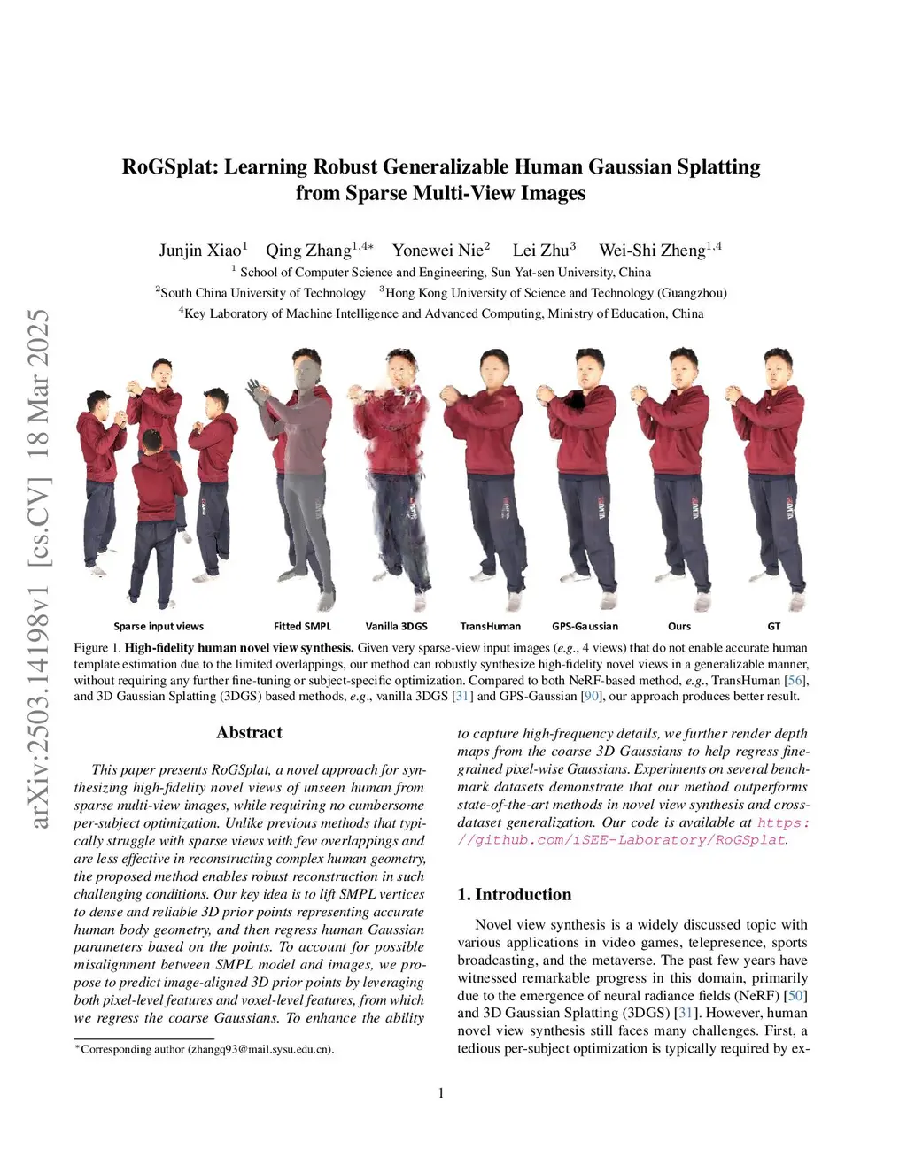 This paper presents RoGSplat, a novel approach for synthesizing high-fidelity novel views of unseen human from sparse multi-view images, while requiring no cumbersome per-subject optimization. Unlike previous methods that typically struggle with sparse views with few overlappings and are less effective in reconstructing complex human geometry, the proposed method enables robust reconstruction in such challenging conditions. Our key idea is to lift SMPL vertices to dense and reliable 3D prior points representing accurate human body geometry, and then regress human Gaussian parameters based on the points. To account for possible misalignment between SMPL model and images, we propose to predict image-aligned 3D prior points by leveraging both pixel-level features and voxel-level features, from which we regress the coarse Gaussians. To enhance the ability to capture high-frequency details, we further render depth maps from the coarse 3D Gaussians to help regress fine-grained pixel-wise Gaussians. Experiments on several benchmark datasets demonstrate that our method outperforms state-of-the-art methods in novel view synthesis and cross-dataset generalization. Our code is available atthis https URL.
