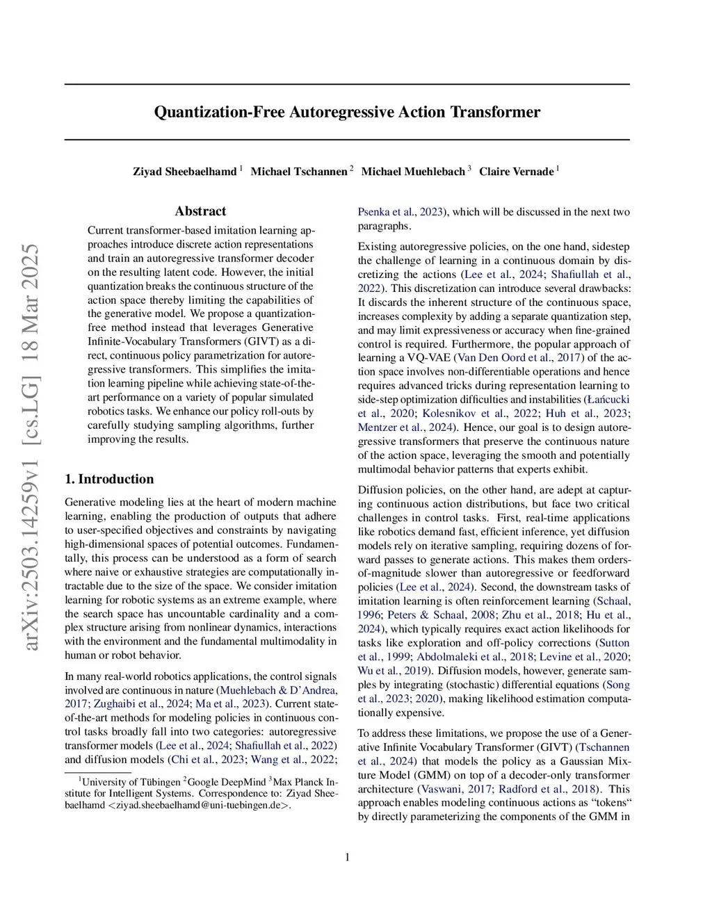 Current transformer-based imitation learning approaches introduce discrete action representations and train an autoregressive transformer decoder on the resulting latent code. However, the initial quantization breaks the continuous structure of the action space thereby limiting the capabilities of the generative model. We propose a quantization-free method instead that leverages Generative Infinite-Vocabulary Transformers (GIVT) as a direct, continuous policy parametrization for autoregressive transformers. This simplifies the imitation learning pipeline while achieving state-of-the-art performance on a variety of popular simulated robotics tasks. We enhance our policy roll-outs by carefully studying sampling algorithms, further improving the results.