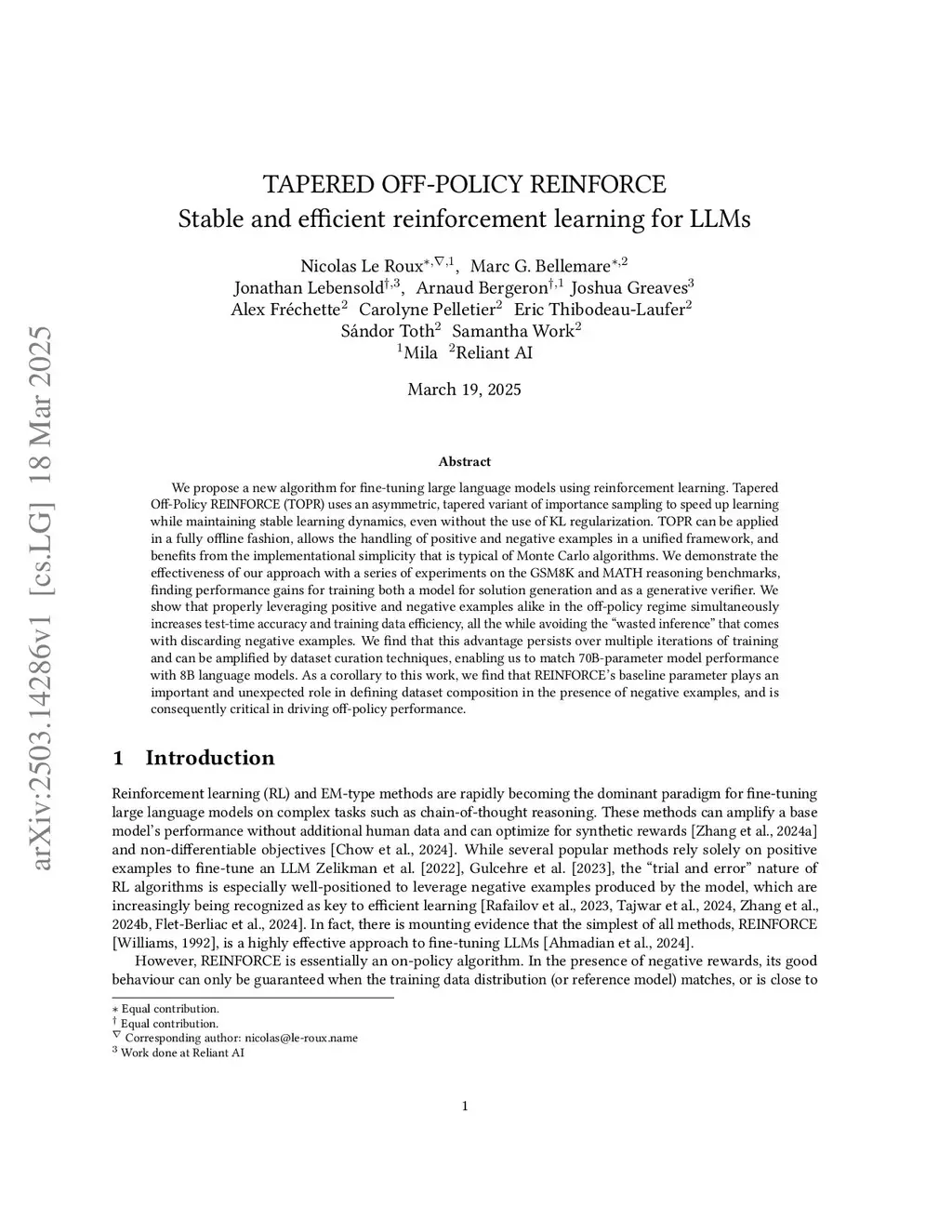 We propose a new algorithm for fine-tuning large language models using reinforcement learning. Tapered Off-Policy REINFORCE (TOPR) uses an asymmetric, tapered variant of importance sampling to speed up learning while maintaining stable learning dynamics, even without the use of KL regularization. TOPR can be applied in a fully offline fashion, allows the handling of positive and negative examples in a unified framework, and benefits from the implementational simplicity that is typical of Monte Carlo algorithms. We demonstrate the effectiveness of our approach with a series of experiments on the GSM8K and MATH reasoning benchmarks, finding performance gains for training both a model for solution generation and as a generative verifier. We show that properly leveraging positive and negative examples alike in the off-policy regime simultaneously increases test-time accuracy and training data efficiency, all the while avoiding the ``wasted inference'' that comes with discarding negative examples. We find that this advantage persists over multiple iterations of training and can be amplified by dataset curation techniques, enabling us to match 70B-parameter model performance with 8B language models. As a corollary to this work, we find that REINFORCE's baseline parameter plays an important and unexpected role in defining dataset composition in the presence of negative examples, and is consequently critical in driving off-policy performance.