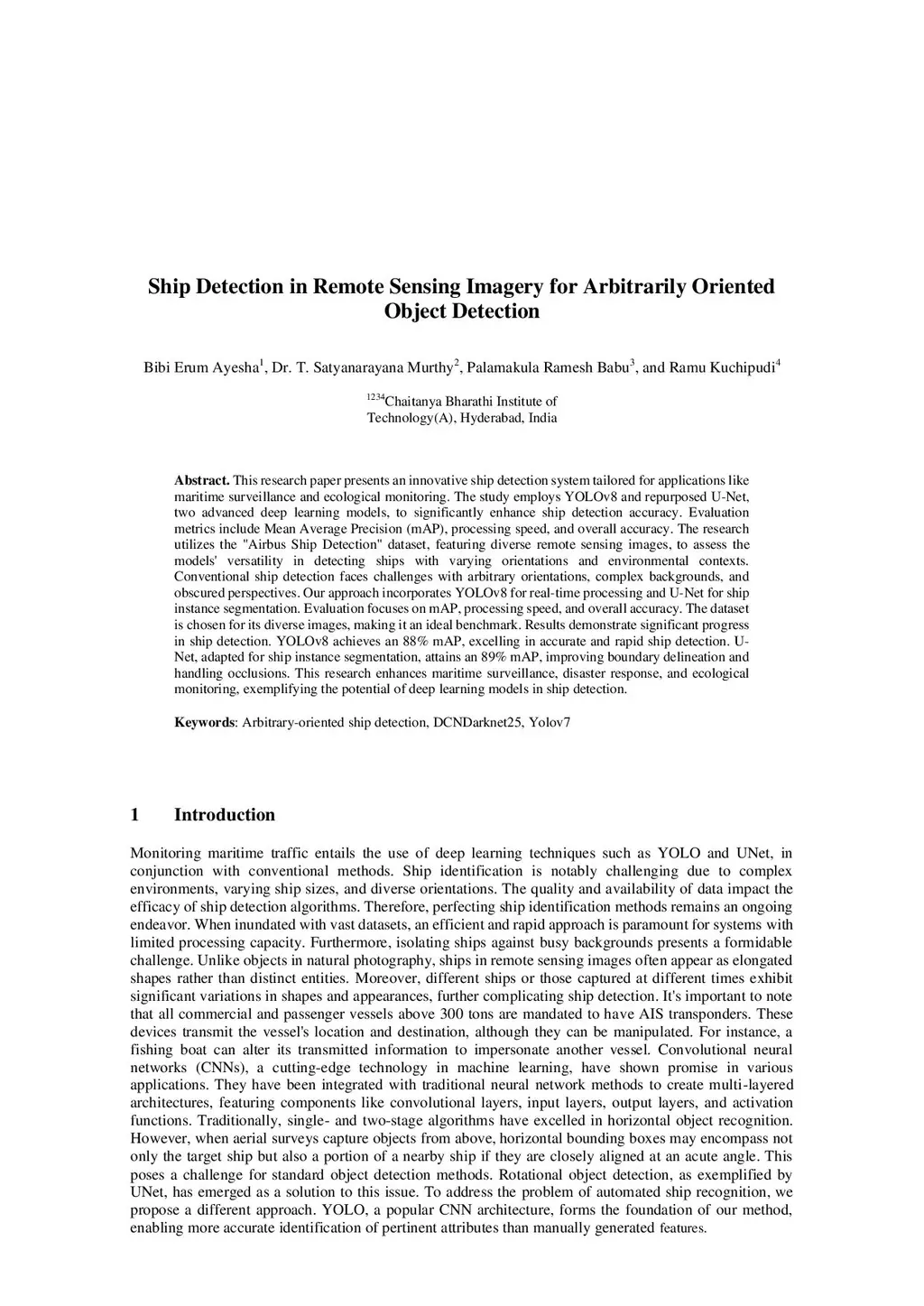 This research paper presents an innovative ship detection system tailored for applications like maritime surveillance and ecological monitoring. The study employs YOLOv8 and repurposed U-Net, two advanced deep learning models, to significantly enhance ship detection accuracy. Evaluation metrics include Mean Average Precision (mAP), processing speed, and overall accuracy. The research utilizes the "Airbus Ship Detection" dataset, featuring diverse remote sensing images, to assess the models' versatility in detecting ships with varying orientations and environmental contexts. Conventional ship detection faces challenges with arbitrary orientations, complex backgrounds, and obscured perspectives. Our approach incorporates YOLOv8 for real-time processing and U-Net for ship instance segmentation. Evaluation focuses on mAP, processing speed, and overall accuracy. The dataset is chosen for its diverse images, making it an ideal benchmark. Results demonstrate significant progress in ship detection. YOLOv8 achieves an 88% mAP, excelling in accurate and rapid ship detection. U Net, adapted for ship instance segmentation, attains an 89% mAP, improving boundary delineation and handling occlusions. This research enhances maritime surveillance, disaster response, and ecological monitoring, exemplifying the potential of deep learning models in ship detection.