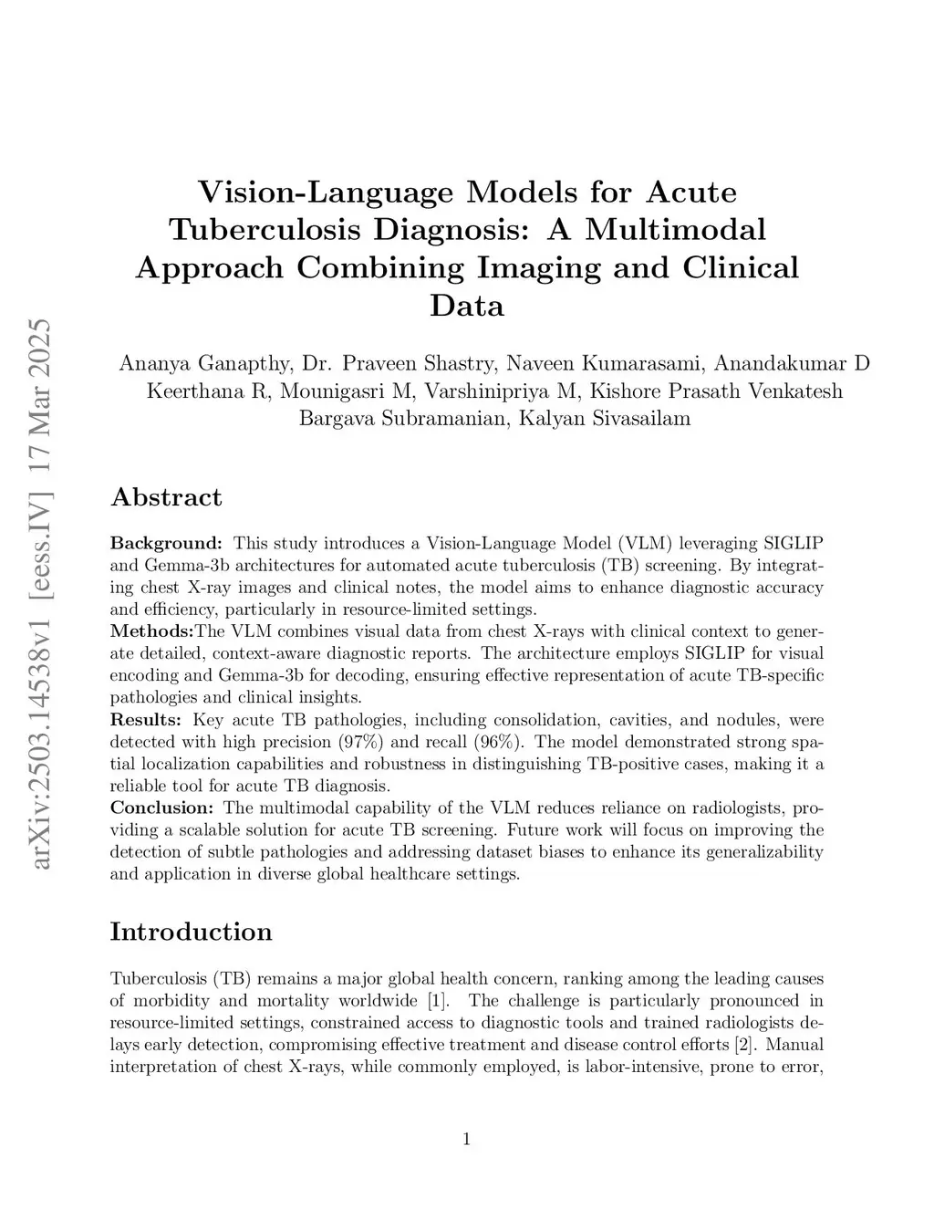 Background: This study introduces a Vision-Language Model (VLM) leveraging SIGLIP and Gemma-3b architectures for automated acute tuberculosis (TB) screening. By integrating chest X-ray images and clinical notes, the model aims to enhance diagnostic accuracy and efficiency, particularly in resource-limited settings.Methods: The VLM combines visual data from chest X-rays with clinical context to generate detailed, context-aware diagnostic reports. The architecture employs SIGLIP for visual encoding and Gemma-3b for decoding, ensuring effective representation of acute TB-specific pathologies and clinical insights.Results: Key acute TB pathologies, including consolidation, cavities, and nodules, were detected with high precision (97percent) and recall (96percent). The model demonstrated strong spatial localization capabilities and robustness in distinguishing TB-positive cases, making it a reliable tool for acute TB diagnosis.Conclusion: The multimodal capability of the VLM reduces reliance on radiologists, providing a scalable solution for acute TB screening. Future work will focus on improving the detection of subtle pathologies and addressing dataset biases to enhance its generalizability and application in diverse global healthcare settings.