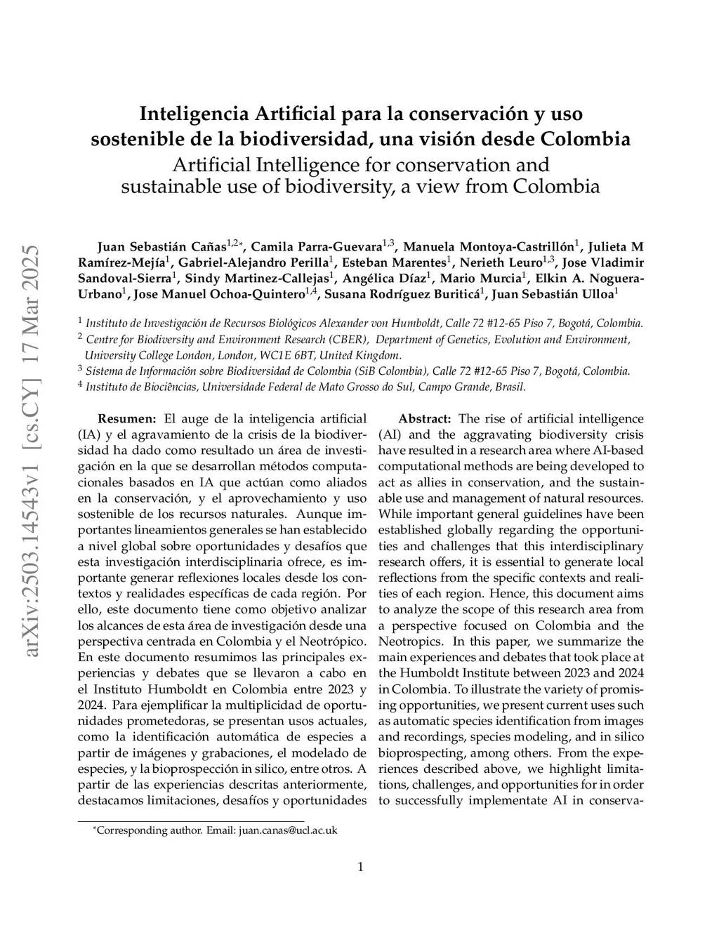 Inteligencia Artificial para la conservación y uso sostenible de la biodiversidad, una visión desde Colombia (Artificial Intelligence for conservation and sustainable use of biodiversity, a view from Colombia)