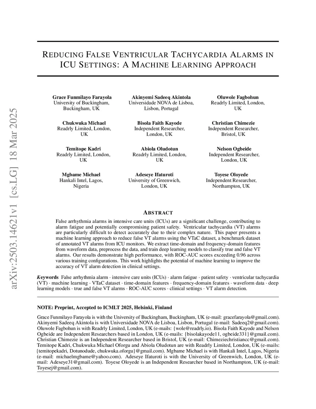 False arrhythmia alarms in intensive care units (ICUs) are a significant challenge, contributing to alarm fatigue and potentially compromising patient safety. Ventricular tachycardia (VT) alarms are particularly difficult to detect accurately due to their complex nature. This paper presents a machine learning approach to reduce false VT alarms using the VTaC dataset, a benchmark dataset of annotated VT alarms from ICU monitors. We extract time-domain and frequency-domain features from waveform data, preprocess the data, and train deep learning models to classify true and false VT alarms. Our results demonstrate high performance, with ROC-AUC scores exceeding 0.96 across various training configurations. This work highlights the potential of machine learning to improve the accuracy of VT alarm detection in clinical settings.