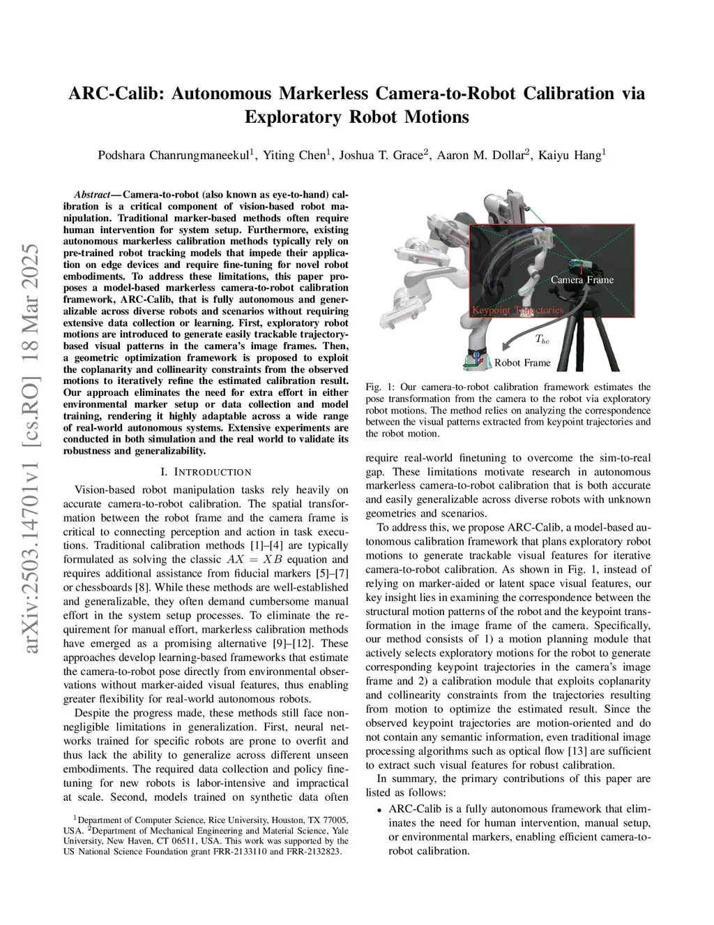 ARC-Calib: Autonomous Markerless Camera-to-Robot Calibration via Exploratory Robot Motions