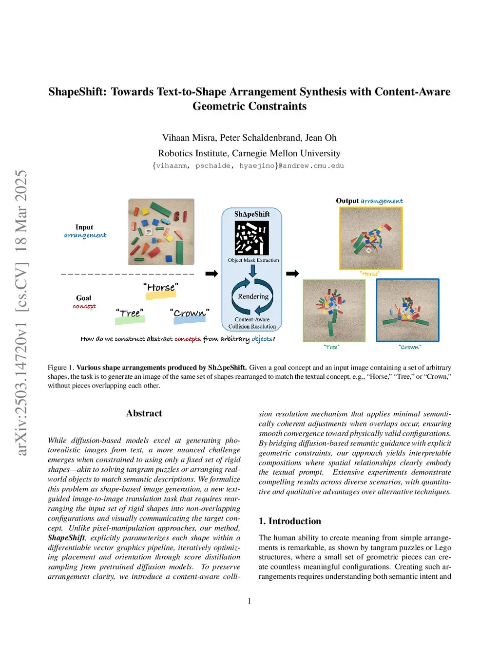 While diffusion-based models excel at generating photorealistic images from text, a more nuanced challenge emerges when constrained to using only a fixed set of rigid shapes, akin to solving tangram puzzles or arranging real-world objects to match semantic descriptions. We formalize this problem as shape-based image generation, a new text-guided image-to-image translation task that requires rearranging the input set of rigid shapes into non-overlapping configurations and visually communicating the target concept. Unlike pixel-manipulation approaches, our method, ShapeShift, explicitly parameterizes each shape within a differentiable vector graphics pipeline, iteratively optimizing placement and orientation through score distillation sampling from pretrained diffusion models. To preserve arrangement clarity, we introduce a content-aware collision resolution mechanism that applies minimal semantically coherent adjustments when overlaps occur, ensuring smooth convergence toward physically valid configurations. By bridging diffusion-based semantic guidance with explicit geometric constraints, our approach yields interpretable compositions where spatial relationships clearly embody the textual prompt. Extensive experiments demonstrate compelling results across diverse scenarios, with quantitative and qualitative advantages over alternative techniques.