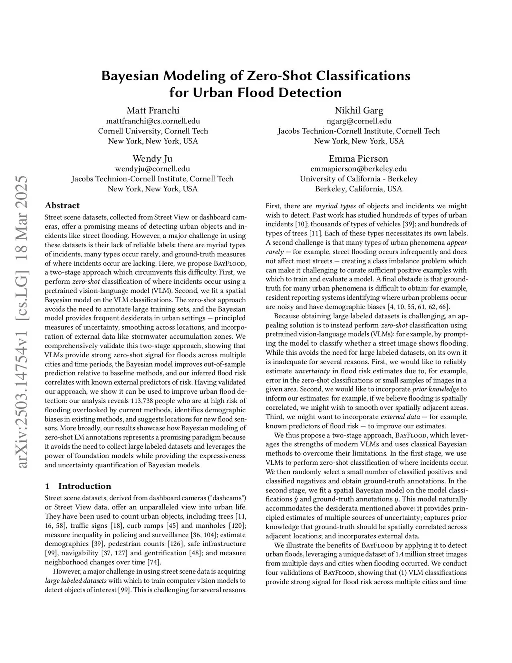 Street scene datasets, collected from Street View or dashboard cameras, offer a promising means of detecting urban objects and incidents like street flooding. However, a major challenge in using these datasets is their lack of reliable labels: there are myriad types of incidents, many types occur rarely, and ground-truth measures of where incidents occur are lacking. Here, we propose BayFlood, a two-stage approach which circumvents this difficulty. First, we perform zero-shot classification of where incidents occur using a pretrained vision-language model (VLM). Second, we fit a spatial Bayesian model on the VLM classifications. The zero-shot approach avoids the need to annotate large training sets, and the Bayesian model provides frequent desiderata in urban settings - principled measures of uncertainty, smoothing across locations, and incorporation of external data like stormwater accumulation zones. We comprehensively validate this two-stage approach, showing that VLMs provide strong zero-shot signal for floods across multiple cities and time periods, the Bayesian model improves out-of-sample prediction relative to baseline methods, and our inferred flood risk correlates with known external predictors of risk. Having validated our approach, we show it can be used to improve urban flood detection: our analysis reveals 113,738 people who are at high risk of flooding overlooked by current methods, identifies demographic biases in existing methods, and suggests locations for new flood sensors. More broadly, our results showcase how Bayesian modeling of zero-shot LM annotations represents a promising paradigm because it avoids the need to collect large labeled datasets and leverages the power of foundation models while providing the expressiveness and uncertainty quantification of Bayesian models.