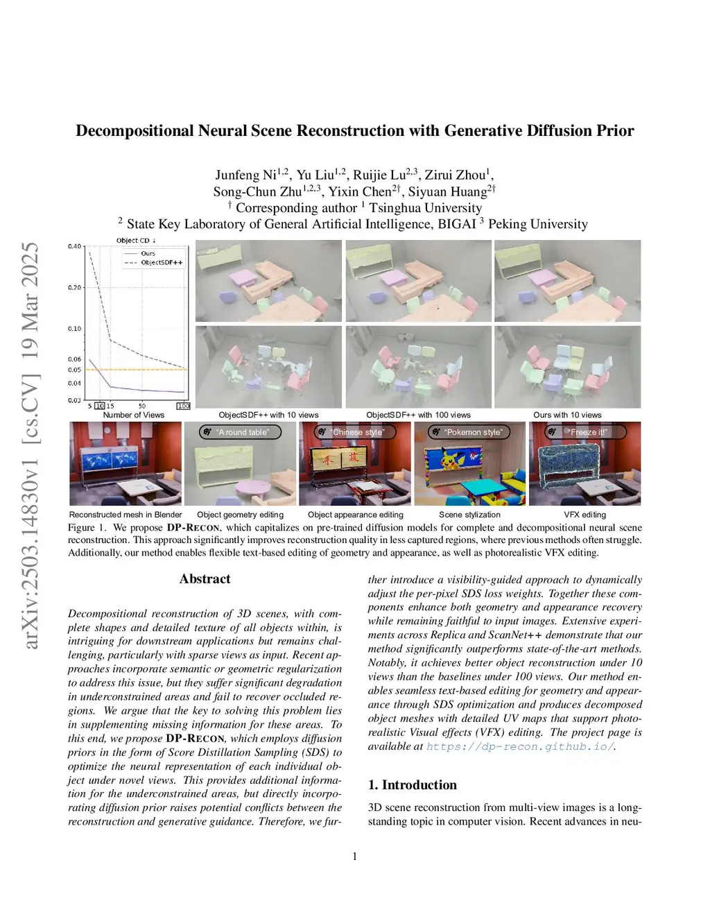 Decompositional reconstruction of 3D scenes, with complete shapes and detailed texture of all objects within, is intriguing for downstream applications but remains challenging, particularly with sparse views as input. Recent approaches incorporate semantic or geometric regularization to address this issue, but they suffer significant degradation in underconstrained areas and fail to recover occluded regions. We argue that the key to solving this problem lies in supplementing missing information for these areas. To this end, we propose DP-Recon, which employs diffusion priors in the form of Score Distillation Sampling (SDS) to optimize the neural representation of each individual object under novel views. This provides additional information for the underconstrained areas, but directly incorporating diffusion prior raises potential conflicts between the reconstruction and generative guidance. Therefore, we further introduce a visibility-guided approach to dynamically adjust the per-pixel SDS loss weights. Together these components enhance both geometry and appearance recovery while remaining faithful to input images. Extensive experiments across Replica and ScanNet++ demonstrate that our method significantly outperforms SOTA methods. Notably, it achieves better object reconstruction under 10 views than the baselines under 100 views. Our method enables seamless text-based editing for geometry and appearance through SDS optimization and produces decomposed object meshes with detailed UV maps that support photorealistic Visual effects (VFX) editing. The project page is available atthis https URL.