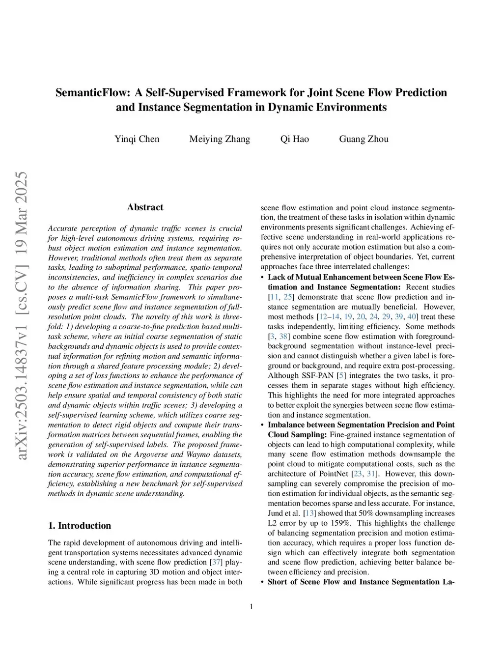 Accurate perception of dynamic traffic scenes is crucial for high-level autonomous driving systems, requiring robust object motion estimation and instance segmentation. However, traditional methods often treat them as separate tasks, leading to suboptimal performance, spatio-temporal inconsistencies, and inefficiency in complex scenarios due to the absence of information sharing. This paper proposes a multi-task SemanticFlow framework to simultaneously predict scene flow and instance segmentation of full-resolution point clouds. The novelty of this work is threefold: 1) developing a coarse-to-fine prediction based multi-task scheme, where an initial coarse segmentation of static backgrounds and dynamic objects is used to provide contextual information for refining motion and semantic information through a shared feature processing module; 2) developing a set of loss functions to enhance the performance of scene flow estimation and instance segmentation, while can help ensure spatial and temporal consistency of both static and dynamic objects within traffic scenes; 3) developing a self-supervised learning scheme, which utilizes coarse segmentation to detect rigid objects and compute their transformation matrices between sequential frames, enabling the generation of self-supervised labels. The proposed framework is validated on the Argoverse and Waymo datasets, demonstrating superior performance in instance segmentation accuracy, scene flow estimation, and computational efficiency, establishing a new benchmark for self-supervised methods in dynamic scene understanding.