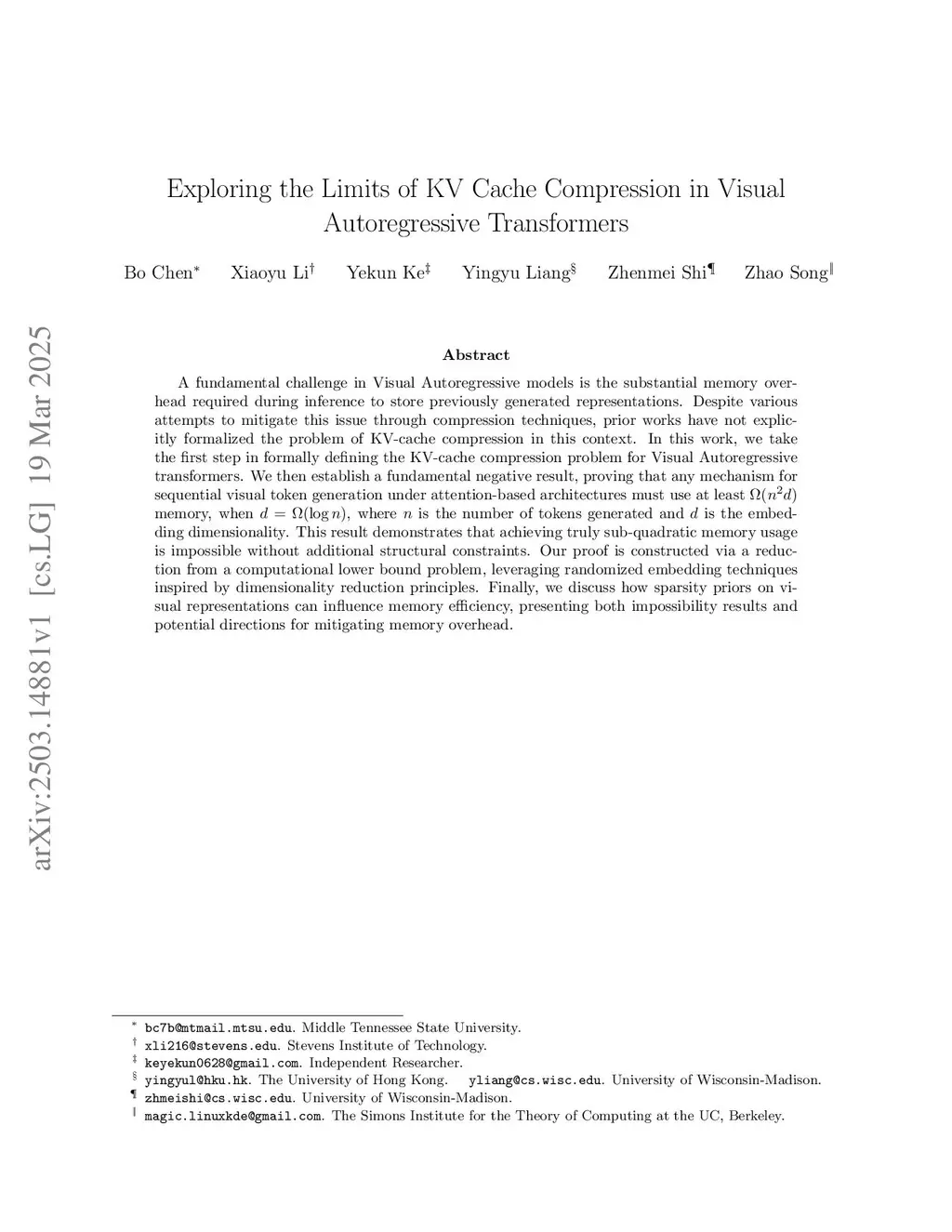 A fundamental challenge in Visual Autoregressive models is the substantial memory overhead required during inference to store previously generated representations. Despite various attempts to mitigate this issue through compression techniques, prior works have not explicitly formalized the problem of KV-cache compression in this context. In this work, we take the first step in formally defining the KV-cache compression problem for Visual Autoregressive transformers. We then establish a fundamental negative result, proving that any mechanism for sequential visual token generation under attention-based architectures must use at least memory, when , where is the number of tokens generated and is the embedding dimensionality. This result demonstrates that achieving truly sub-quadratic memory usage is impossible without additional structural constraints. Our proof is constructed via a reduction from a computational lower bound problem, leveraging randomized embedding techniques inspired by dimensionality reduction principles. Finally, we discuss how sparsity priors on visual representations can influence memory efficiency, presenting both impossibility results and potential directions for mitigating memory overhead.