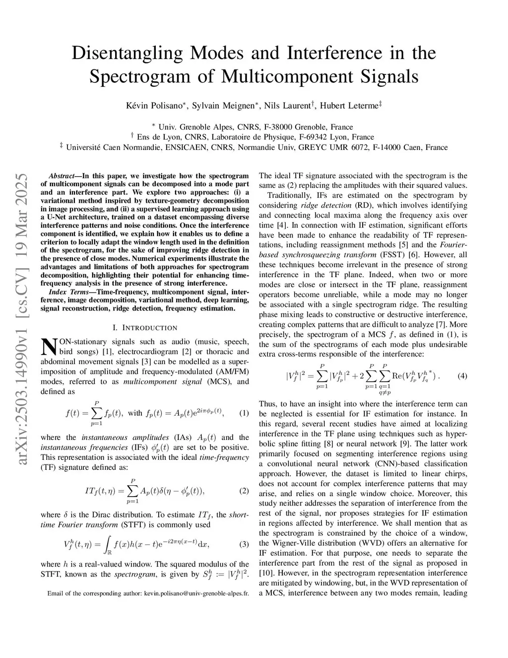 In this paper, we investigate how the spectrogram of multicomponent signals can be decomposed into a mode part and an interference part. We explore two approaches: (i) a variational method inspired by texture-geometry decomposition in image processing, and (ii) a supervised learning approach using a U-Net architecture, trained on a dataset encompassing diverse interference patterns and noise conditions. Once the interference component is identified, we explain how it enables us to define a criterion to locally adapt the window length used in the definition of the spectrogram, for the sake of improving ridge detection in the presence of close modes. Numerical experiments illustrate the advantages and limitations of both approaches for spectrogram decomposition, highlighting their potential for enhancing time-frequency analysis in the presence of strong interference.