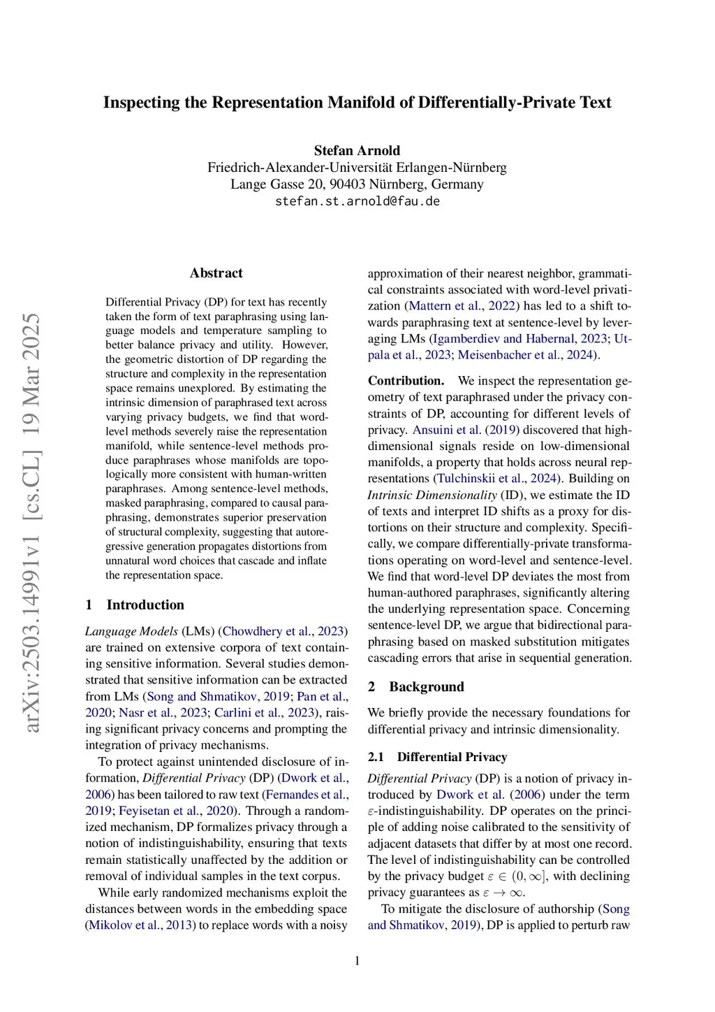 Differential Privacy (DP) for text has recently taken the form of text paraphrasing using language models and temperature sampling to better balance privacy and utility. However, the geometric distortion of DP regarding the structure and complexity in the representation space remains unexplored. By estimating the intrinsic dimension of paraphrased text across varying privacy budgets, we find that word-level methods severely raise the representation manifold, while sentence-level methods produce paraphrases whose manifolds are topologically more consistent with human-written paraphrases. Among sentence-level methods, masked paraphrasing, compared to causal paraphrasing, demonstrates superior preservation of structural complexity, suggesting that autoregressive generation propagates distortions from unnatural word choices that cascade and inflate the representation space.