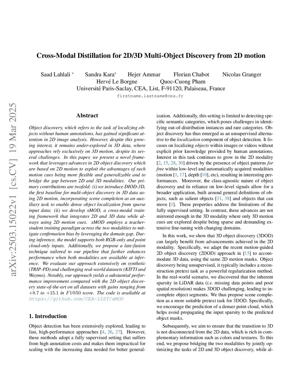 Object discovery, which refers to the task of localizing objects without human annotations, has gained significant attention in 2D image analysis. However, despite this growing interest, it remains under-explored in 3D data, where approaches rely exclusively on 3D motion, despite its several challenges. In this paper, we present a novel framework that leverages advances in 2D object discovery which are based on 2D motion to exploit the advantages of such motion cues being more flexible and generalizable and to bridge the gap between 2D and 3D modalities. Our primary contributions are twofold: (i) we introduce DIOD-3D, the first baseline for multi-object discovery in 3D data using 2D motion, incorporating scene completion as an auxiliary task to enable dense object localization from sparse input data; (ii) we develop xMOD, a cross-modal training framework that integrates 2D and 3D data while always using 2D motion cues. xMOD employs a teacher-student training paradigm across the two modalities to mitigate confirmation bias by leveraging the domain gap. During inference, the model supports both RGB-only and point cloud-only inputs. Additionally, we propose a late-fusion technique tailored to our pipeline that further enhances performance when both modalities are available at inference. We evaluate our approach extensively on synthetic (TRIP-PD) and challenging real-world datasets (KITTI and Waymo). Notably, our approach yields a substantial performance improvement compared with the 2D object discovery state-of-the-art on all datasets with gains ranging from +8.7 to +15.1 in F1@50 score. The code is available atthis https URL