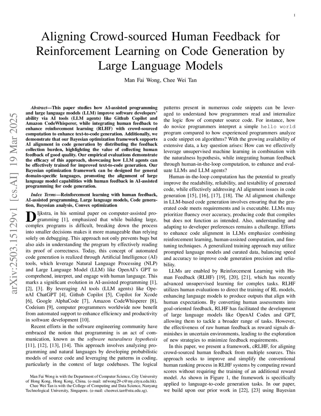 This paper studies how AI-assisted programming and large language models (LLM) improve software developers' ability via AI tools (LLM agents) like Github Copilot and Amazon CodeWhisperer, while integrating human feedback to enhance reinforcement learning (RLHF) with crowd-sourced computation to enhance text-to-code generation. Additionally, we demonstrate that our Bayesian optimization framework supports AI alignment in code generation by distributing the feedback collection burden, highlighting the value of collecting human feedback of good quality. Our empirical evaluations demonstrate the efficacy of this approach, showcasing how LLM agents can be effectively trained for improved text-to-code generation. Our Bayesian optimization framework can be designed for general domain-specific languages, promoting the alignment of large language model capabilities with human feedback in AI-assisted programming for code generation.