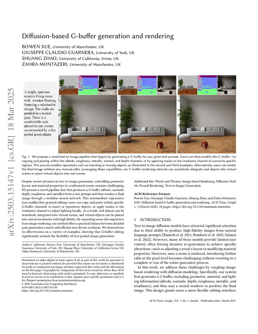 Despite recent advances in text-to-image generation, controlling geometric layout and PBR material properties in synthesized scenes remains challenging. We present a pipeline that first produces a G-buffer (albedo, normals, depth, roughness, shading, and metallic) from a text prompt and then renders a final image through a PBR-inspired branch network. This intermediate representation enables fine-grained control: users can copy and paste within specific G-buffer channels to insert or reposition objects, or apply masks to the irradiance channel to adjust lighting locally. As a result, real objects can be seamlessly integrated into virtual scenes. By separating user-friendly scene description from image rendering, our method offers a practical balance between detailed post-generation control and efficient text-driven synthesis. We demonstrate its effectiveness through quantitative evaluations and a user study with 156 participants, showing consistent human preference over strong baselines and confirming that G-buffer control extends the flexibility of text-guided image generation.