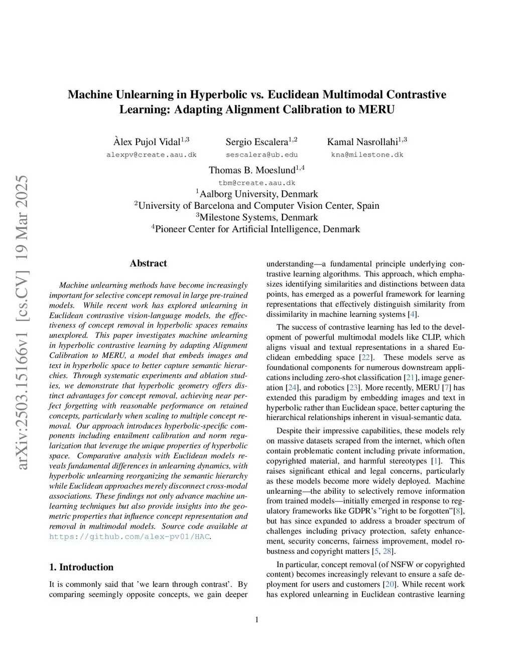 Machine unlearning methods have become increasingly important for selective concept removal in large pre-trained models. While recent work has explored unlearning in Euclidean contrastive vision-language models, the effectiveness of concept removal in hyperbolic spaces remains unexplored. This paper investigates machine unlearning in hyperbolic contrastive learning by adapting Alignment Calibration to MERU, a model that embeds images and text in hyperbolic space to better capture semantic hierarchies. Through systematic experiments and ablation studies, we demonstrate that hyperbolic geometry offers distinct advantages for concept removal, achieving near perfect forgetting with reasonable performance on retained concepts, particularly when scaling to multiple concept removal. Our approach introduces hyperbolic-specific components including entailment calibration and norm regularization that leverage the unique properties of hyperbolic space. Comparative analysis with Euclidean models reveals fundamental differences in unlearning dynamics, with hyperbolic unlearning reorganizing the semantic hierarchy while Euclidean approaches merely disconnect cross-modal associations. These findings not only advance machine unlearning techniques but also provide insights into the geometric properties that influence concept representation and removal in multimodal models. Source code available atthis https URL