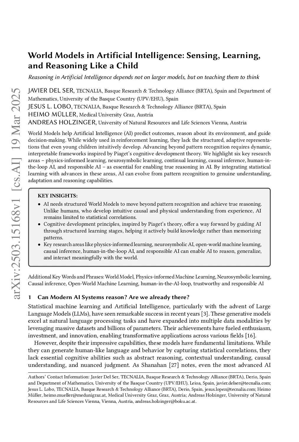 World Models help Artificial Intelligence (AI) predict outcomes, reason about its environment, and guide decision-making. While widely used in reinforcement learning, they lack the structured, adaptive representations that even young children intuitively develop. Advancing beyond pattern recognition requires dynamic, interpretable frameworks inspired by Piaget's cognitive development theory. We highlight six key research areas -- physics-informed learning, neurosymbolic learning, continual learning, causal inference, human-in-the-loop AI, and responsible AI -- as essential for enabling true reasoning in AI. By integrating statistical learning with advances in these areas, AI can evolve from pattern recognition to genuine understanding, adaptation and reasoning capabilities.