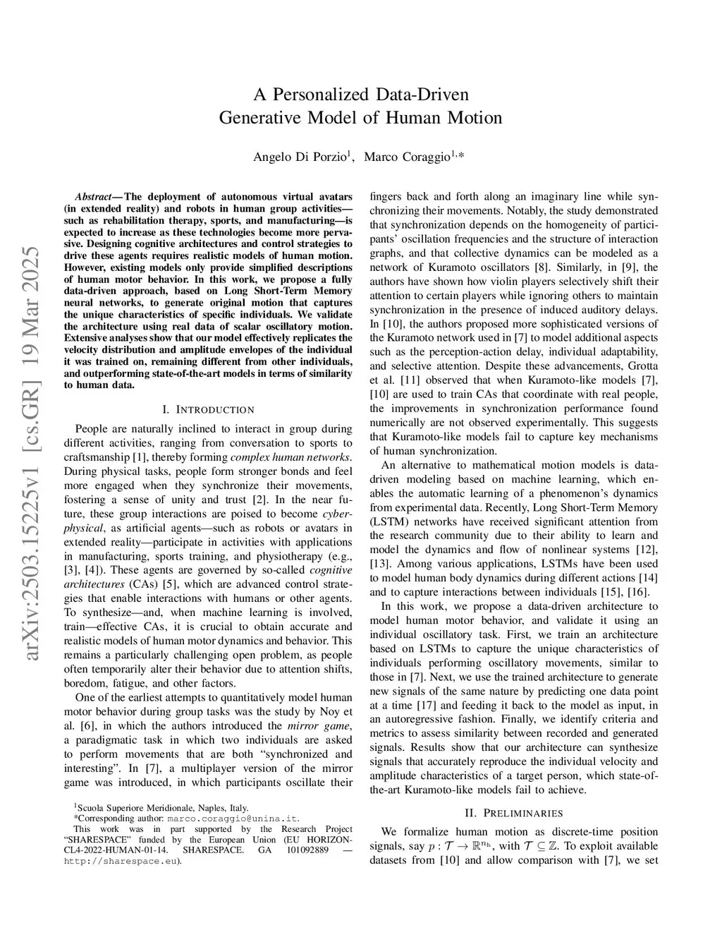 The deployment of autonomous virtual avatars (in extended reality) and robots in human group activities -- such as rehabilitation therapy, sports, and manufacturing -- is expected to increase as these technologies become more pervasive. Designing cognitive architectures and control strategies to drive these agents requires realistic models of human motion. Furthermore, recent research has shown that each person exhibits a unique velocity signature, highlighting how individual motor behaviors are both rich in variability and internally consistent. However, existing models only provide simplified descriptions of human motor behavior, hindering the development of effective cognitive architectures. In this work, we first show that motion amplitude provides a valid and complementary characterization of individual motor signatures. Then, we propose a fully data-driven approach, based on long short-term memory neural networks, to generate original motion that captures the unique features of specific individuals. We validate the architecture using real human data from participants performing spontaneous oscillatory motion. Extensive analyses show that state-of-the-art Kuramoto-like models fail to replicate individual motor signatures, whereas our model accurately reproduces the velocity distribution and amplitude envelopes of the individual it was trained on, while remaining distinct from others.