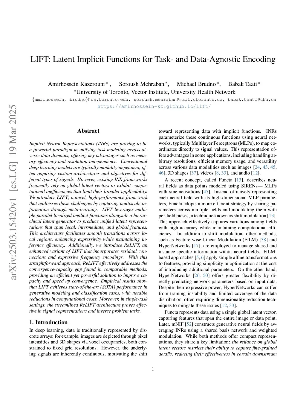 Implicit Neural Representations (INRs) are proving to be a powerful paradigm in unifying task modeling across diverse data domains, offering key advantages such as memory efficiency and resolution independence. Conventional deep learning models are typically modality-dependent, often requiring custom architectures and objectives for different types of signals. However, existing INR frameworks frequently rely on global latent vectors or exhibit computational inefficiencies that limit their broader applicability. We introduce LIFT, a novel, high-performance framework that addresses these challenges by capturing multiscale information through meta-learning. LIFT leverages multiple parallel localized implicit functions alongside a hierarchical latent generator to produce unified latent representations that span local, intermediate, and global features. This architecture facilitates smooth transitions across local regions, enhancing expressivity while maintaining inference efficiency. Additionally, we introduce ReLIFT, an enhanced variant of LIFT that incorporates residual connections and expressive frequency encodings. With this straightforward approach, ReLIFT effectively addresses the convergence-capacity gap found in comparable methods, providing an efficient yet powerful solution to improve capacity and speed up convergence. Empirical results show that LIFT achieves state-of-the-art (SOTA) performance in generative modeling and classification tasks, with notable reductions in computational costs. Moreover, in single-task settings, the streamlined ReLIFT architecture proves effective in signal representations and inverse problem tasks.