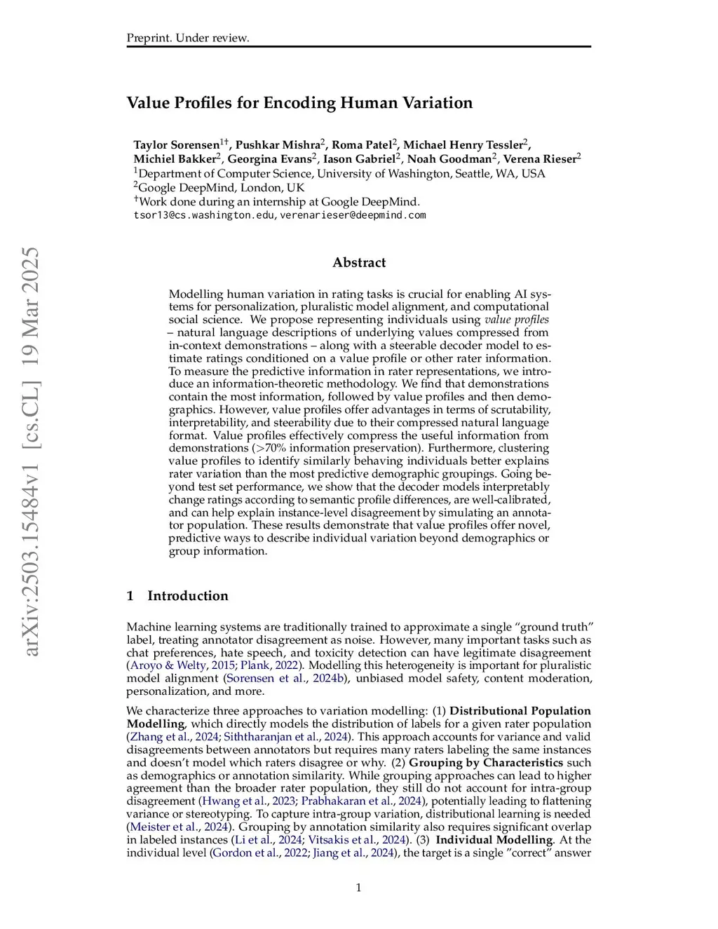Modelling human variation in rating tasks is crucial for personalization, pluralistic model alignment, and computational social science. We propose representing individuals using natural language value profiles -- descriptions of underlying values compressed from in-context demonstrations -- along with a steerable decoder model that estimates individual ratings from a rater representation. To measure the predictive information in a rater representation, we introduce an information-theoretic methodology and find that demonstrations contain the most information, followed by value profiles, then demographics. However, value profiles effectively compress the useful information from demonstrations (>70% information preservation) and offer advantages in terms of scrutability, interpretability, and steerability. Furthermore, clustering value profiles to identify similarly behaving individuals better explains rater variation than the most predictive demographic groupings. Going beyond test set performance, we show that the decoder predictions change in line with semantic profile differences, are well-calibrated, and can help explain instance-level disagreement by simulating an annotator population. These results demonstrate that value profiles offer novel, predictive ways to describe individual variation beyond demographics or group information.
