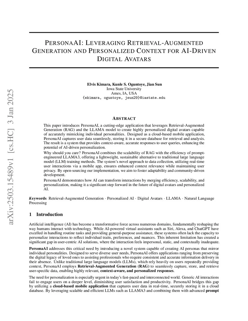 This paper introduces PersonaAI, a cutting-edge application that leverages Retrieval-Augmented Generation (RAG) and the LLAMA model to create highly personalized digital avatars capable of accurately mimicking individual personalities. Designed as a cloud-based mobile application, PersonaAI captures user data seamlessly, storing it in a secure database for retrieval and analysis. The result is a system that provides context-aware, accurate responses to user queries, enhancing the potential of AI-driven personalization.Why should you care? PersonaAI combines the scalability of RAG with the efficiency of prompt-engineered LLAMA3, offering a lightweight, sustainable alternative to traditional large language model (LLM) training methods. The system's novel approach to data collection, utilizing real-time user interactions via a mobile app, ensures enhanced context relevance while maintaining user privacy. By open-sourcing our implementation, we aim to foster adaptability and community-driven development.PersonaAI demonstrates how AI can transform interactions by merging efficiency, scalability, and personalization, making it a significant step forward in the future of digital avatars and personalized AI.