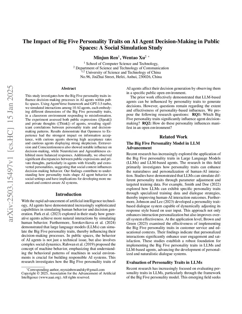 This study investigates how the Big Five personality traits influence decision-making processes in AI agents within public spaces. Using AgentVerse framework and GPT-3.5-turbo, we simulated interactions among 10 AI agents, each embodying different dimensions of the Big Five personality traits, in a classroom environment responding to misinformation. The experiment assessed both public expressions ([Speak]) and private thoughts ([Think]) of agents, revealing significant correlations between personality traits and decision-making patterns. Results demonstrate that Openness to Experience had the strongest impact on information acceptance, with curious agents showing high acceptance rates and cautious agents displaying strong skepticism. Extraversion and Conscientiousness also showed notable influence on decision-making, while Neuroticism and Agreeableness exhibited more balanced responses. Additionally, we observed significant discrepancies between public expressions and private thoughts, particularly in agents with friendly and extroverted personalities, suggesting that social context influences decision-making behavior. Our findings contribute to understanding how personality traits shape AI agent behavior in social settings and have implications for developing more nuanced and context-aware AI systems.