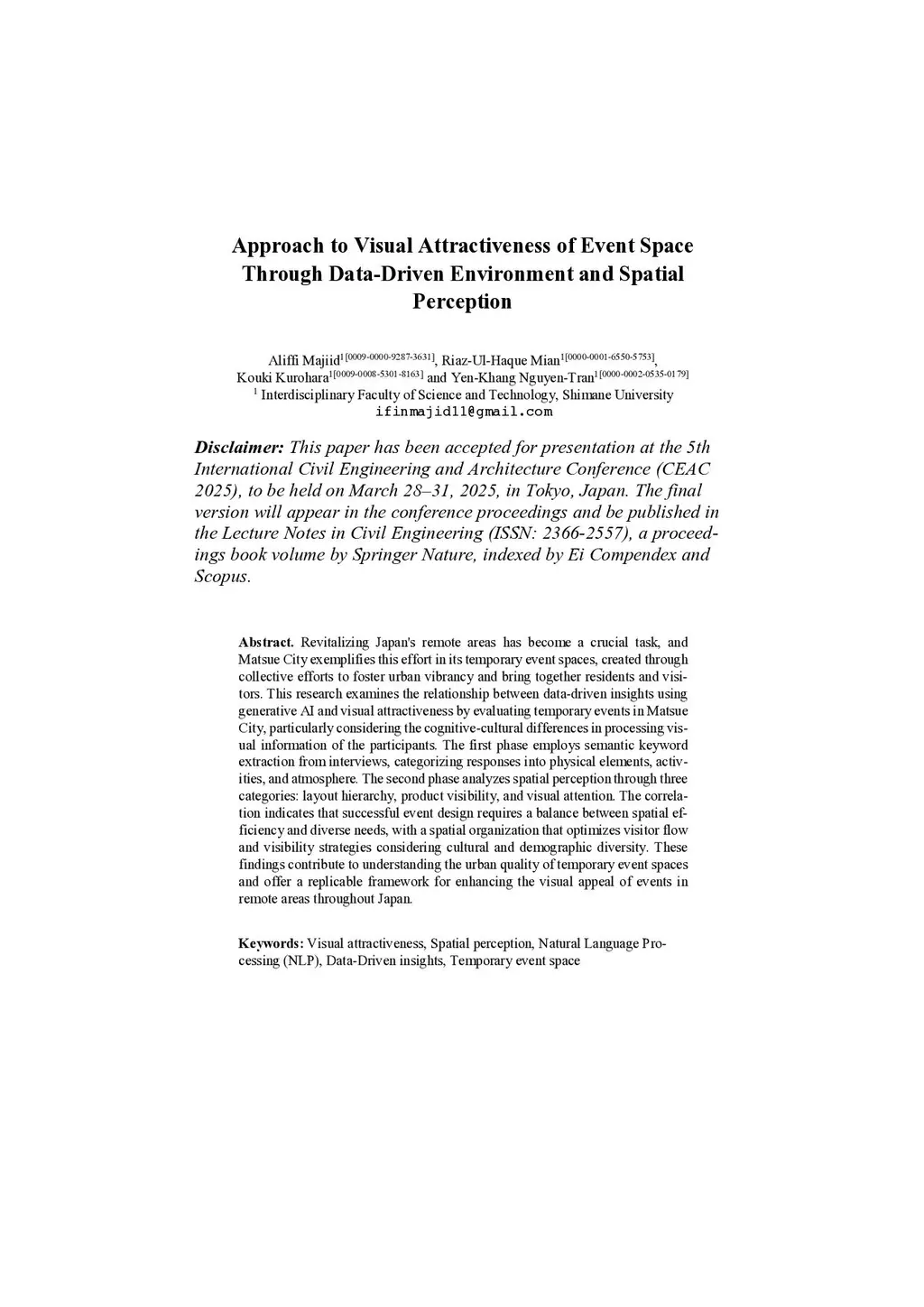 Revitalizing Japan's remote areas has become a crucial task, and Matsue City exemplifies this effort in its temporary event spaces, created through collective efforts to foster urban vibrancy and bring together residents and visitors. This research examines the relationship between data-driven in-sights using generative AI and visual attractiveness by evaluating tempo-rary events in Matsue City, particularly considering the cognitive-cultural differences in processing visual information of the participants. The first phase employs semantic keyword extraction from interviews, categorizing responses into physical elements, activities, and atmosphere. The second phase analyzes spatial perception through three categories: layout hierar-chy, product visibility, and visual attention. The correlation indicates that successful event design requires a balance between spatial efficiency and diverse needs, with a spatial organization that optimizes visitor flow and visibility strategies considering cultural and demographic diversity. These findings contribute to understanding the urban quality of temporary event spaces and offer a replicable framework for enhancing the visual appeal of events in remote areas throughout Japan.