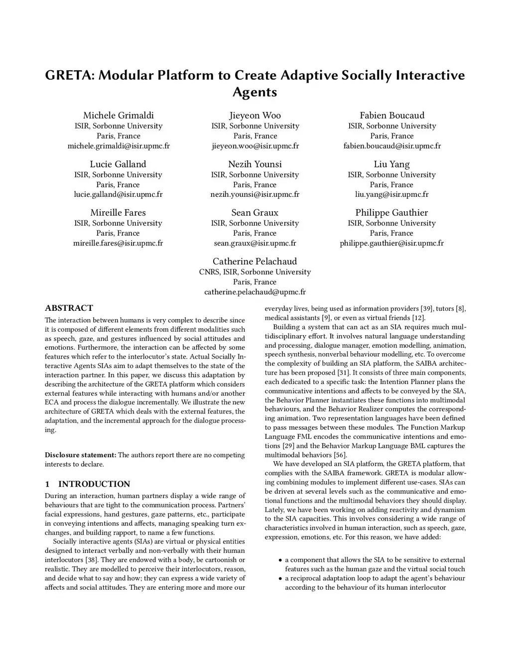 GRETA: Modular Platform to Create Adaptive Socially Interactive Agents