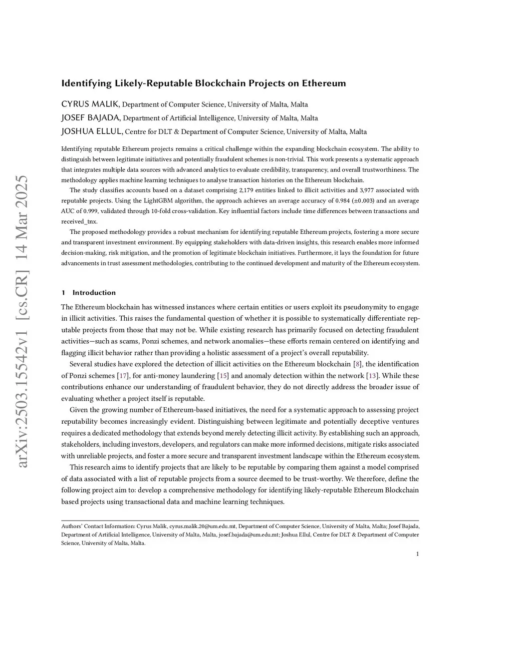 Identifying Likely-Reputable Blockchain Projects on Ethereum