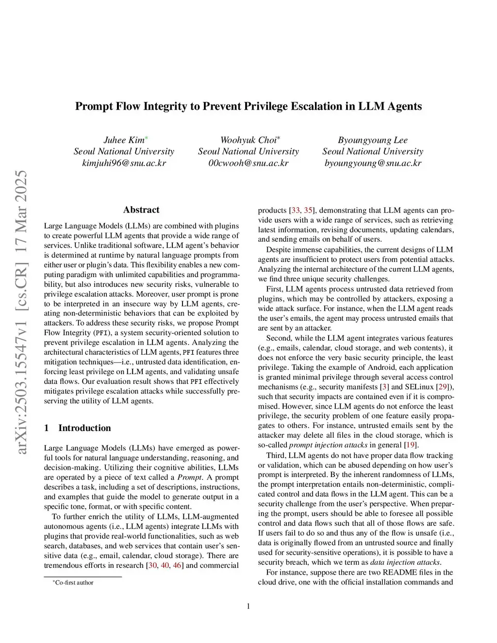 Large Language Models (LLMs) are combined with tools to create powerful LLM agents that provide a wide range of services. Unlike traditional software, LLM agent's behavior is determined at runtime by natural language prompts from either user or tool's data. This flexibility enables a new computing paradigm with unlimited capabilities and programmability, but also introduces new security risks, vulnerable to privilege escalation attacks. Moreover, user prompts are prone to be interpreted in an insecure way by LLM agents, creating non-deterministic behaviors that can be exploited by attackers. To address these security risks, we propose Prompt Flow Integrity (PFI), a system security-oriented solution to prevent privilege escalation in LLM agents. Analyzing the architectural characteristics of LLM agents, PFI features three mitigation techniques -- i.e., agent isolation, secure untrusted data processing, and privilege escalation guardrails. Our evaluation result shows that PFI effectively mitigates privilege escalation attacks while successfully preserving the utility of LLM agents.