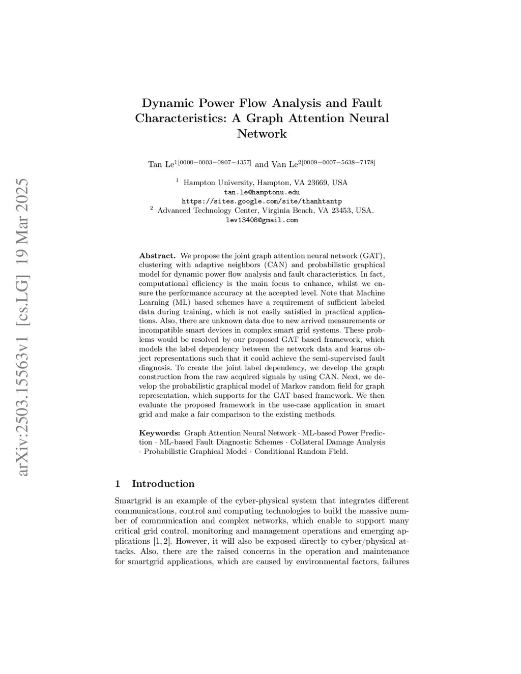 We propose the joint graph attention neural network (GAT), clustering with adaptive neighbors (CAN) and probabilistic graphical model for dynamic power flow analysis and fault characteristics. In fact, computational efficiency is the main focus to enhance, whilst we ensure the performance accuracy at the accepted level. Note that Machine Learning (ML) based schemes have a requirement of sufficient labeled data during training, which is not easily satisfied in practical applications. Also, there are unknown data due to new arrived measurements or incompatible smart devices in complex smart grid systems. These problems would be resolved by our proposed GAT based framework, which models the label dependency between the network data and learns object representations such that it could achieve the semi-supervised fault diagnosis. To create the joint label dependency, we develop the graph construction from the raw acquired signals by using CAN. Next, we develop the probabilistic graphical model of Markov random field for graph representation, which supports for the GAT based framework. We then evaluate the proposed framework in the use-case application in smart grid and make a fair comparison to the existing methods.