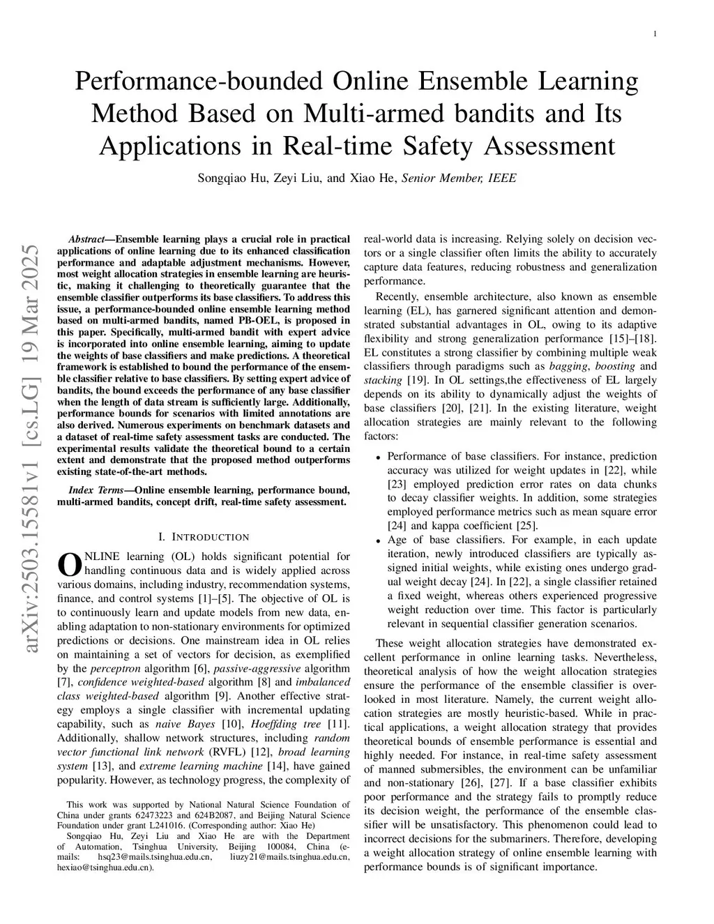 Performance-bounded Online Ensemble Learning Method Based on Multi-armed bandits and Its Applications in Real-time Safety Assessment