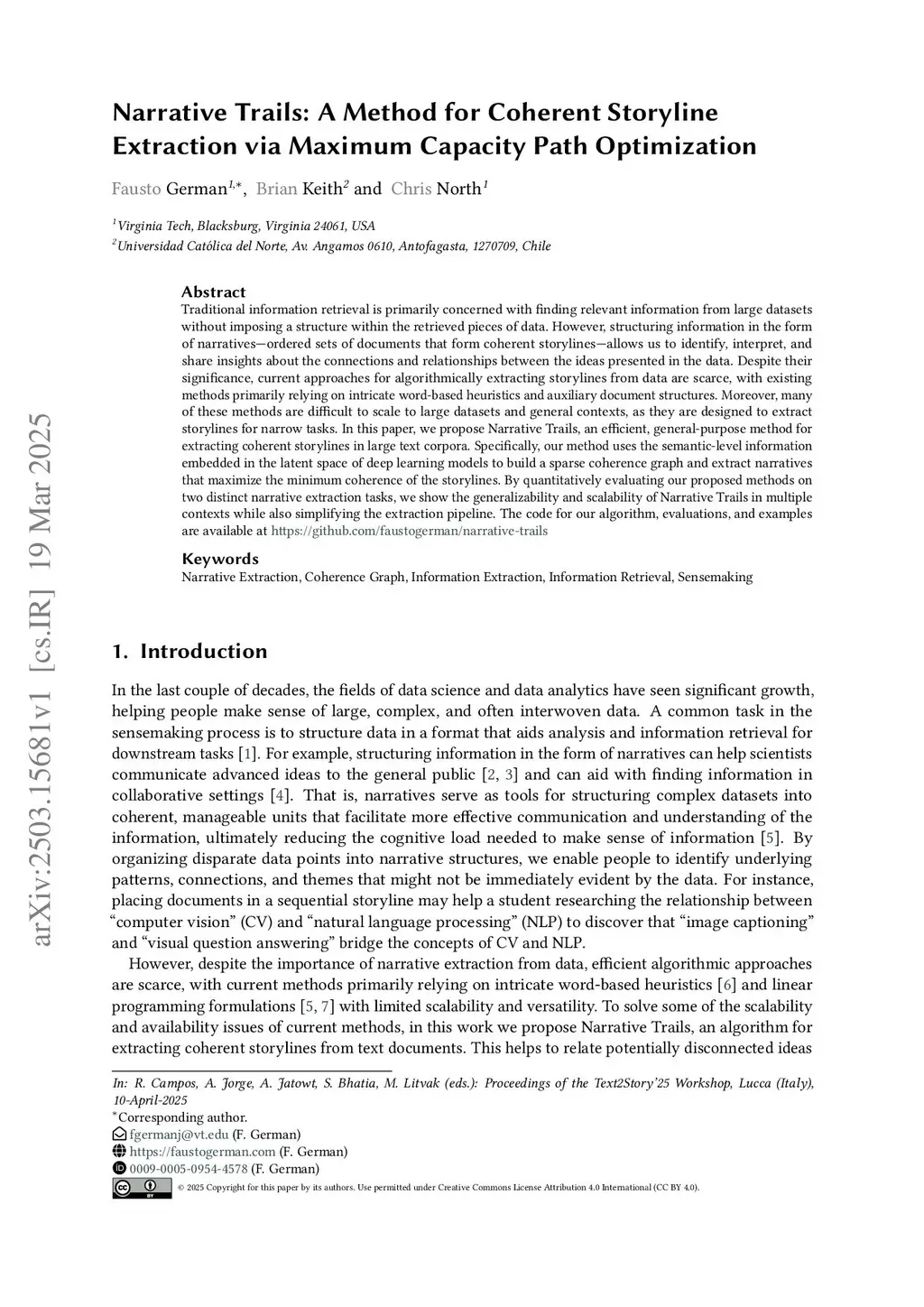 Traditional information retrieval is primarily concerned with finding relevant information from large datasets without imposing a structure within the retrieved pieces of data. However, structuring information in the form of narratives--ordered sets of documents that form coherent storylines--allows us to identify, interpret, and share insights about the connections and relationships between the ideas presented in the data. Despite their significance, current approaches for algorithmically extracting storylines from data are scarce, with existing methods primarily relying on intricate word-based heuristics and auxiliary document structures. Moreover, many of these methods are difficult to scale to large datasets and general contexts, as they are designed to extract storylines for narrow tasks. In this paper, we propose Narrative Trails, an efficient, general-purpose method for extracting coherent storylines in large text corpora. Specifically, our method uses the semantic-level information embedded in the latent space of deep learning models to build a sparse coherence graph and extract narratives that maximize the minimum coherence of the storylines. By quantitatively evaluating our proposed methods on two distinct narrative extraction tasks, we show the generalizability and scalability of Narrative Trails in multiple contexts while also simplifying the extraction pipeline.