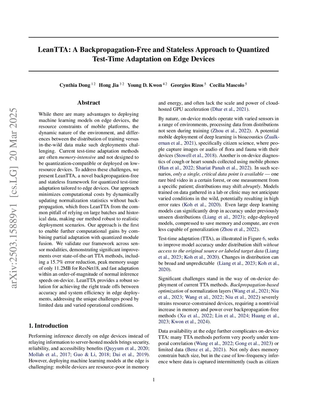 While there are many advantages to deploying machine learning models on edge devices, the resource constraints of mobile platforms, the dynamic nature of the environment, and differences between the distribution of training versus in-the-wild data make such deployments challenging. Current test-time adaptation methods are often memory-intensive and not designed to be quantization-compatible or deployed on low-resource devices. To address these challenges, we present LeanTTA, a novel backpropagation-free and stateless framework for quantized test-time adaptation tailored to edge devices. Our approach minimizes computational costs by dynamically updating normalization statistics without backpropagation, which frees LeanTTA from the common pitfall of relying on large batches and historical data, making our method robust to realistic deployment scenarios. Our approach is the first to enable further computational gains by combining partial adaptation with quantized module fusion. We validate our framework across sensor modalities, demonstrating significant improvements over state-of-the-art TTA methods, including a 15.7% error reduction, peak memory usage of only 11.2MB for ResNet18, and fast adaptation within an order-of-magnitude of normal inference speeds on-device. LeanTTA provides a robust solution for achieving the right trade offs between accuracy and system efficiency in edge deployments, addressing the unique challenges posed by limited data and varied operational conditions.