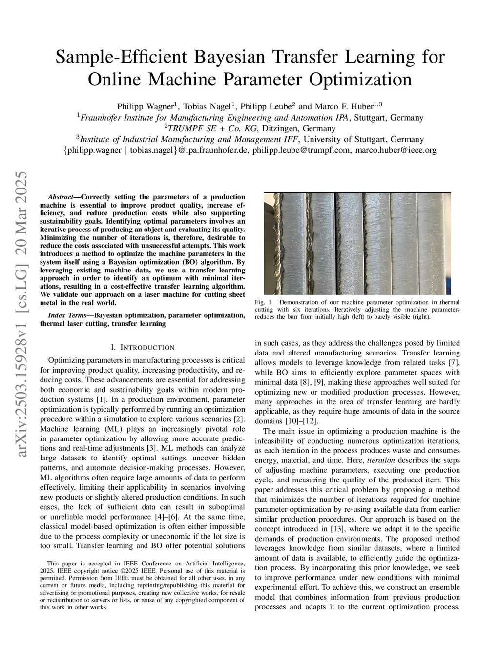 Correctly setting the parameters of a production machine is essential to improve product quality, increase efficiency, and reduce production costs while also supporting sustainability goals. Identifying optimal parameters involves an iterative process of producing an object and evaluating its quality. Minimizing the number of iterations is, therefore, desirable to reduce the costs associated with unsuccessful attempts. This work introduces a method to optimize the machine parameters in the system itself using a Bayesian optimization algorithm. By leveraging existing machine data, we use a transfer learning approach in order to identify an optimum with minimal iterations, resulting in a cost-effective transfer learning algorithm. We validate our approach on a laser machine for cutting sheet metal in the real world.