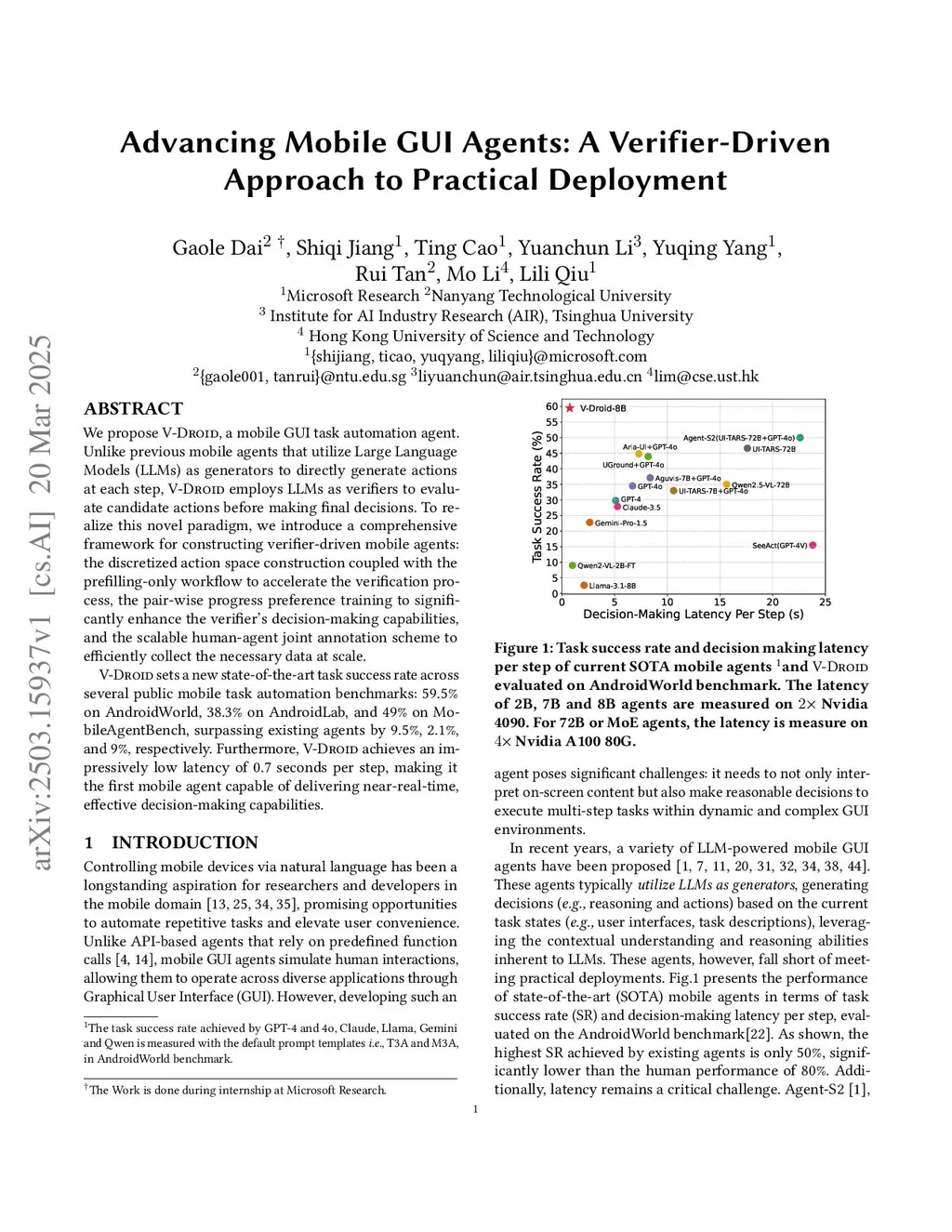 We propose V-Droid, a mobile GUI task automation agent. Unlike previous mobile agents that utilize Large Language Models (LLMs) as generators to directly generate actions at each step, V-Droid employs LLMs as verifiers to evaluate candidate actions before making final decisions. To realize this novel paradigm, we introduce a comprehensive framework for constructing verifier-driven mobile agents: the discretized action space construction coupled with the prefilling-only workflow to accelerate the verification process, the pair-wise progress preference training to significantly enhance the verifier's decision-making capabilities, and the scalable human-agent joint annotation scheme to efficiently collect the necessary data at scale. V-Droid obtains a substantial task success rate across several public mobile task automation benchmarks: 59.5% on AndroidWorld, 38.3% on AndroidLab, and 49% on MobileAgentBench, surpassing existing agents by 5.2%, 2.1%, and 9%, respectively. Furthermore, V-Droid achieves a remarkably low latency of 4.3s per step, which is 6.1x faster compared with existing mobile agents. The source code is available atthis https URL.