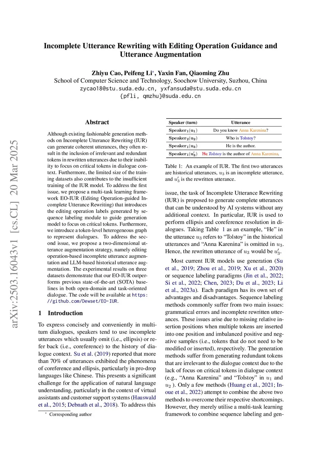 Although existing fashionable generation methods on Incomplete Utterance Rewriting (IUR) can generate coherent utterances, they often result in the inclusion of irrelevant and redundant tokens in rewritten utterances due to their inability to focus on critical tokens in dialogue context. Furthermore, the limited size of the training datasets also contributes to the insufficient training of the IUR model. To address the first issue, we propose a multi-task learning framework EO-IUR (Editing Operation-guided Incomplete Utterance Rewriting) that introduces the editing operation labels generated by sequence labeling module to guide generation model to focus on critical tokens. Furthermore, we introduce a token-level heterogeneous graph to represent dialogues. To address the second issue, we propose a two-dimensional utterance augmentation strategy, namely editing operation-based incomplete utterance augmentation and LLM-based historical utterance augmentation. The experimental results on three datasets demonstrate that our EO-IUR outperforms previous state-of-the-art (SOTA) baselines in both open-domain and task-oriented dialogue. The code will be available atthis https URL.