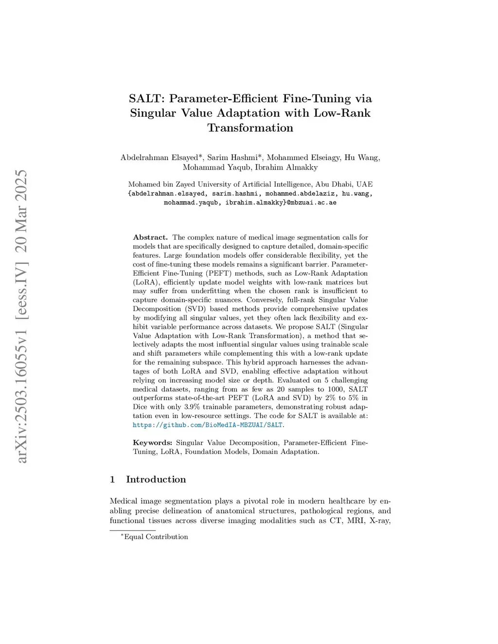 The complex nature of medical image segmentation calls for models that are specifically designed to capture detailed, domain-specific features. Large foundation models offer considerable flexibility, yet the cost of fine-tuning these models remains a significant barrier. Parameter-Efficient Fine-Tuning (PEFT) methods, such as Low-Rank Adaptation (LoRA), efficiently update model weights with low-rank matrices but may suffer from underfitting when the chosen rank is insufficient to capture domain-specific nuances. Conversely, full-rank Singular Value Decomposition (SVD) based methods provide comprehensive updates by modifying all singular values, yet they often lack flexibility and exhibit variable performance across datasets. We propose SALT (Singular Value Adaptation with Low-Rank Transformation), a method that selectively adapts the most influential singular values using trainable scale and shift parameters while complementing this with a low-rank update for the remaining subspace. This hybrid approach harnesses the advantages of both LoRA and SVD, enabling effective adaptation without relying on increasing model size or depth. Evaluated on 5 challenging medical datasets, ranging from as few as 20 samples to 1000, SALT outperforms state-of-the-art PEFT (LoRA and SVD) by 2% to 5% in Dice with only 3.9% trainable parameters, demonstrating robust adaptation even in low-resource settings. The code for SALT is available at:this https URL