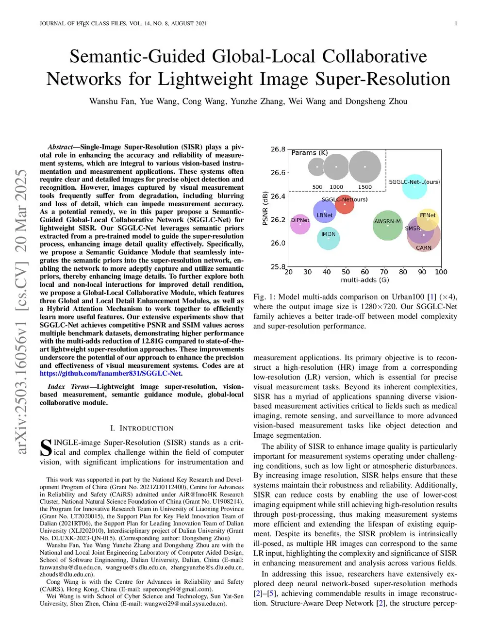 Single-Image Super-Resolution (SISR) plays a pivotal role in enhancing the accuracy and reliability of measurement systems, which are integral to various vision-based instrumentation and measurement applications. These systems often require clear and detailed images for precise object detection and recognition. However, images captured by visual measurement tools frequently suffer from degradation, including blurring and loss of detail, which can impede measurementthis http URLa potential remedy, we in this paper propose a Semantic-Guided Global-Local Collaborative Network (SGGLC-Net) for lightweight SISR. Our SGGLC-Net leverages semantic priors extracted from a pre-trained model to guide the super-resolution process, enhancing image detail quality effectively. Specifically,we propose a Semantic Guidance Module that seamlessly integrates the semantic priors into the super-resolution network, enabling the network to more adeptly capture and utilize semantic priors, thereby enhancing image details. To further explore both local and non-local interactions for improved detail rendition,we propose a Global-Local Collaborative Module, which features three Global and Local Detail Enhancement Modules, as well as a Hybrid Attention Mechanism to work together to efficiently learn more useful features. Our extensive experiments show that SGGLC-Net achieves competitive PSNR and SSIM values across multiple benchmark datasets, demonstrating higher performance with the multi-adds reduction of 12.81G compared to state-of-the-art lightweight super-resolution approaches. These improvements underscore the potential of our approach to enhance the precision and effectiveness of visual measurement systems. Codes are atthis https URL.
