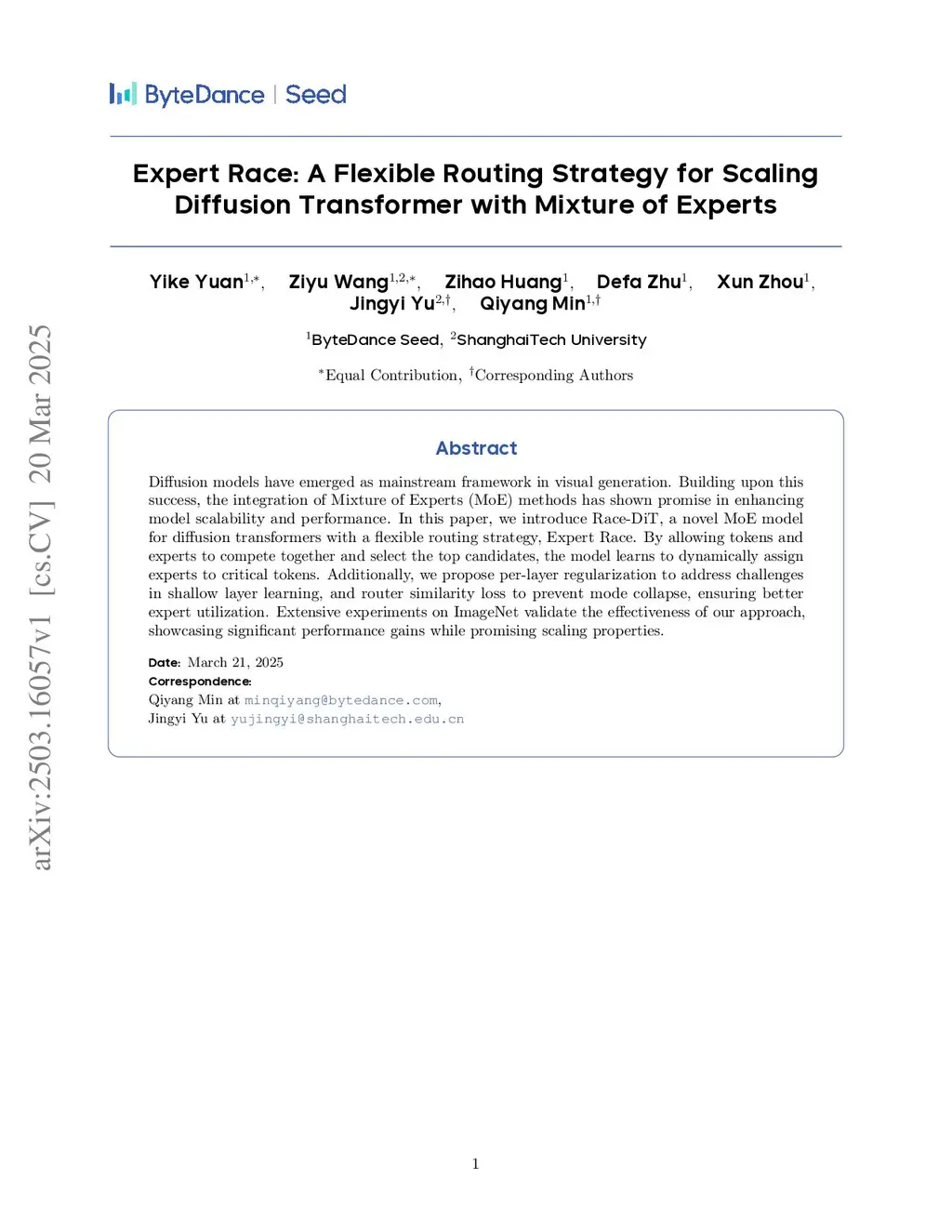 Diffusion models have emerged as mainstream framework in visual generation. Building upon this success, the integration of Mixture of Experts (MoE) methods has shown promise in enhancing model scalability and performance. In this paper, we introduce Race-DiT, a novel MoE model for diffusion transformers with a flexible routing strategy, Expert Race. By allowing tokens and experts to compete together and select the top candidates, the model learns to dynamically assign experts to critical tokens. Additionally, we propose per-layer regularization to address challenges in shallow layer learning, and router similarity loss to prevent mode collapse, ensuring better expert utilization. Extensive experiments on ImageNet validate the effectiveness of our approach, showcasing significant performance gains while promising scaling properties.