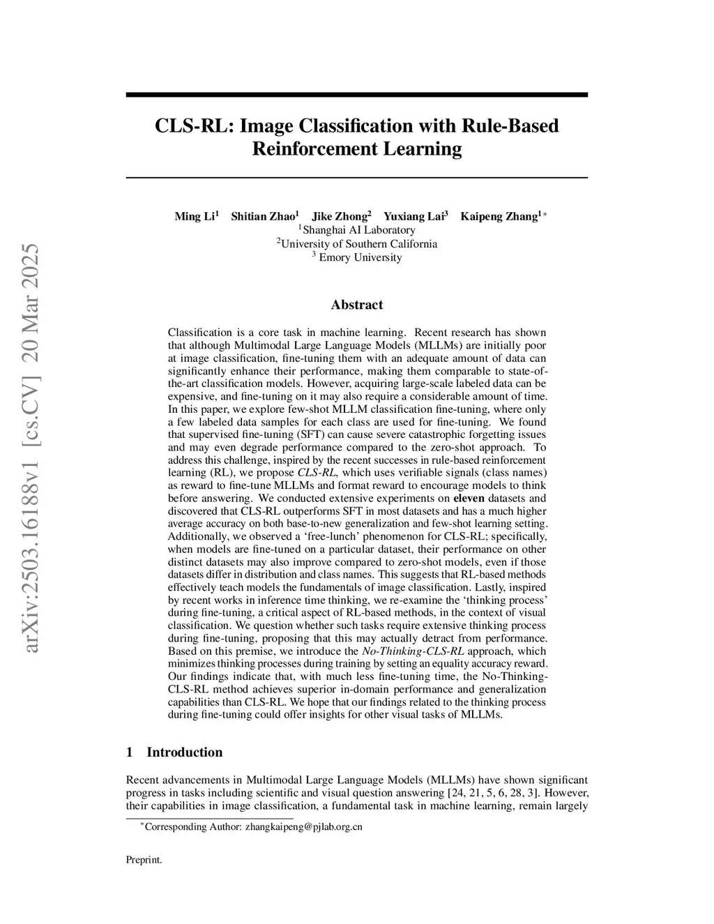 This paper investigates the role of explicit thinking process in rule-based reinforcement fine-tuning (RFT) for MLLMs. We first propose CLS-RL for MLLM image classification, using verifiable rewards for fine-tuning. Experiments show CLS-RL significantly outperforms SFT and yields a cross-dataset generalization effect. We then rethink and question whether explicit thinking in RFT is always necessary. Challenging the convention that explicit thinking is crucial for the success of RFT, we introduce No-Thinking-RL, exploring RFT without thinking by introducing a simple equality accuracy reward. We evaluate No-Thinking-RL on 6 diverse tasks across different model sizes and types. Experimental results reveal three key findings: 1). Visual perception tasks do not require thinking during RFT, as No-Thinking-RL consistently outperforms or matches Thinking-based RFT across model sizes. 2).} Models with limited capabilities struggle to generate high-quality CoT for RFT, making Thinking-based RFT less effective than No-Thinking-RL. 3). There are inconsistencies between the answers in the thinking and answer tags for some responses of thinking-based RFT, which show lower accuracy than the overall accuracy. We hypothesize that explicit thinking before verifiable answers may hinder reward convergence and reduce performance. To test this hypothesis, we propose Think-After-Answer, which places thinking after the answer to mitigate this effect for experimental verification. Lastly, we conduct a pilot study to explore whether MLLMs can learn when to think during RFT, introducing an Adaptive-Thinking method. Experiments show that it converges to a specific prompt depending on model capability and task complexity, achieving comparable or better performance than both Thinking and No-Thinking-RL. This suggests MLLMs can adaptively decide to think or not based on their capabilities and task complexity.