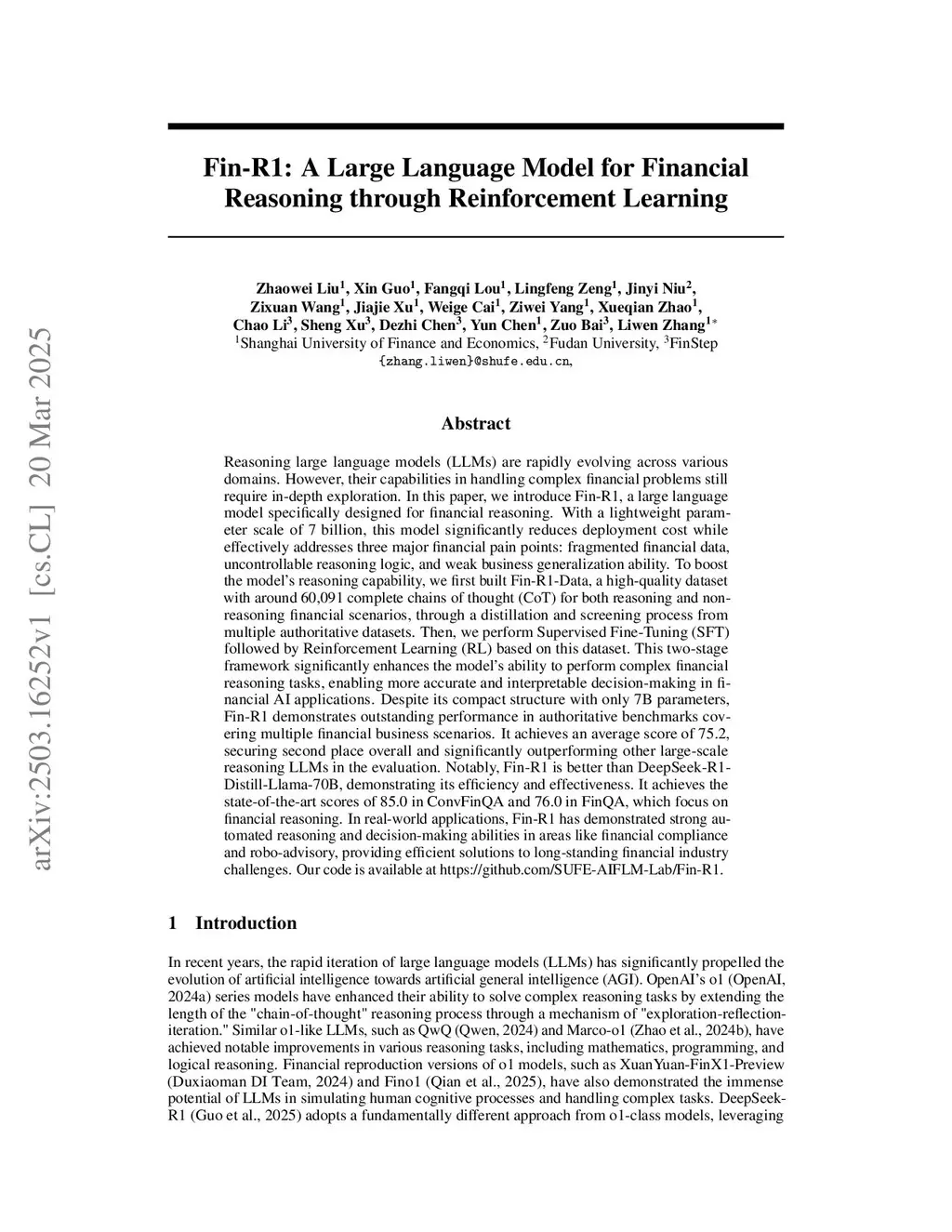 In recent years, general-purpose large language models (LLMs) such as GPT, Gemini, Claude, and DeepSeek have advanced at an unprecedented pace. Despite these achievements, their application to finance remains challenging, due to fragmented data sources, intransparent reasoning processes, and weak transferability to business applications. In response, we introduce Fin-R1, a reasoning LLM designed for financial scenarios. With a compact size of 7 billion parameters, Fin-R1 reduces deployment costs while addressing the aforementioned challenges. Its development follows a two-stage pipeline. First, we construct Fin-R1-Data, a high-quality financial dataset consisting of 60,091 chain-of-thought (CoT) samples, distilled and filtered from multiple authoritative benchmarks to ensure consistency and reliability. Second, we train Fin-R1 using Fin-R1-Data through supervised fine-tuning (SFT), followed by reinforcement learning (RL). This stage substantially improves the model's ability to solve complex financial reasoning tasks, yielding outputs that are both accurate and interpretable. Despite its relatively small parameter scale, Fin-R1 achieves competitive empirical performance across established financial benchmarks and demonstrates practical utility in compliance checking and robo-advisory. Our code is publicly available atthis https URL, and has already attracted over 700 stars.