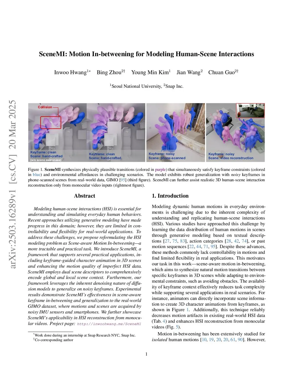 Modeling human-scene interactions (HSI) is essential for understanding and simulating everyday human behaviors. Recent approaches utilizing generative modeling have made progress in this domain; however, they are limited in controllability and flexibility for real-world applications. To address these challenges, we propose reformulating the HSI modeling problem as Scene-aware Motion In-betweening - a more tractable and practical task. We introduce SceneMI, a framework that supports several practical applications, including keyframe-guided character animation in 3D scenes and enhancing the motion quality of imperfect HSI data. SceneMI employs dual scene descriptors to comprehensively encode global and local scene context. Furthermore, our framework leverages the inherent denoising nature of diffusion models to generalize on noisy keyframes. Experimental results demonstrate SceneMI's effectiveness in scene-aware keyframe in-betweening and generalization to the real-world GIMO dataset, where motions and scenes are acquired by noisy IMU sensors and smartphones. We further showcase SceneMI's applicability in HSI reconstruction from monocular videos.