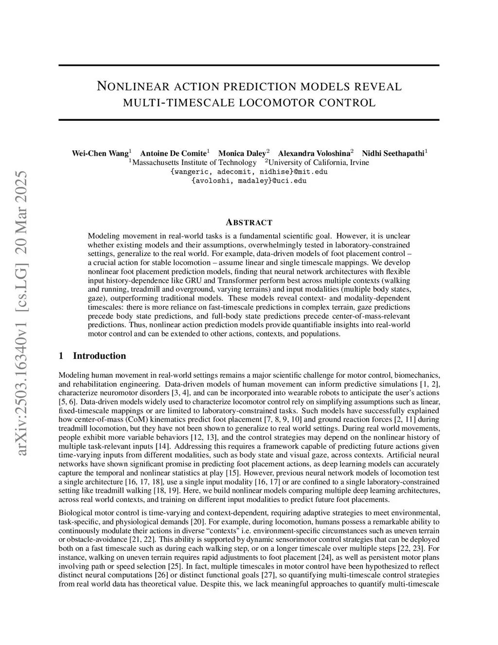 Everyday locomotion is a complex sensorimotor process that can unfold over multiple timescales, from long-term path planning to rapid, reactive adjustments. However, we lack an understanding of how factors such as environmental demands, or the available sensory information simultaneously influence these control timescales. To address this, we present a unified data-driven framework to quantify the control timescales by identifying how early we can predict future actions from past inputs. We apply this framework across tasks including walking and running, environmental contexts including treadmill, overground, and varied terrains, and sensory input modalities including gaze fixations and body states. We find that deep neural network architectures that effectively handle long-range dependencies, specifically Gated Recurrent Units and Transformers, outperform other architectures and widely used linear models when predicting future actions. Our framework reveals the factors that influence locomotor foot placement control timescales. Across environmental contexts, we discover that humans rely more on fast timescale control in more complex terrain. Across input modalities, we find a hierarchy of control timescales where gaze predicts foot placement before full-body states, which predict before center-of-mass states. Our model also identifies mid-swing as a critical phase when the swing foot's state predicts its future placement, with this timescale adapting across environments. Overall, this work offers data-driven insights into locomotor control in everyday settings, offering models that can be integrated with rehabilitation technologies and movement simulations to improve their applicability in everyday settings.