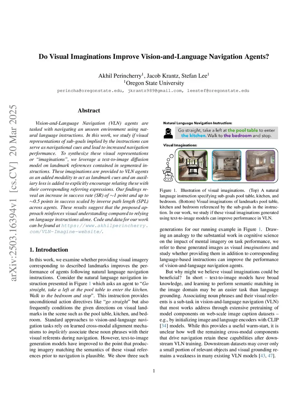 Vision-and-Language Navigation (VLN) agents are tasked with navigating an unseen environment using natural language instructions. In this work, we study if visual representations of sub-goals implied by the instructions can serve as navigational cues and lead to increased navigation performance. To synthesize these visual representations or imaginations, we leverage a text-to-image diffusion model on landmark references contained in segmented instructions. These imaginations are provided to VLN agents as an added modality to act as landmark cues and an auxiliary loss is added to explicitly encourage relating these with their corresponding referring expressions. Our findings reveal an increase in success rate (SR) of around 1 point and up to 0.5 points in success scaled by inverse path length (SPL) across agents. These results suggest that the proposed approach reinforces visual understanding compared to relying on language instructions alone. Code and data for our work can be found atthis https URL.