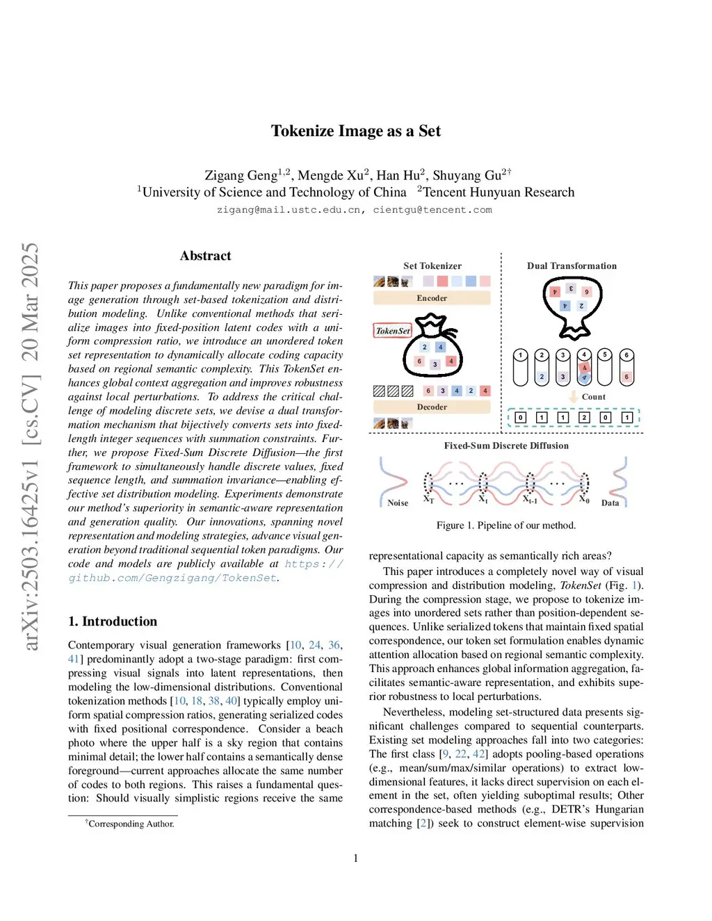 This paper proposes a fundamentally new paradigm for image generation through set-based tokenization and distribution modeling. Unlike conventional methods that serialize images into fixed-position latent codes with a uniform compression ratio, we introduce an unordered token set representation to dynamically allocate coding capacity based on regional semantic complexity. This TokenSet enhances global context aggregation and improves robustness against local perturbations. To address the critical challenge of modeling discrete sets, we devise a dual transformation mechanism that bijectively converts sets into fixed-length integer sequences with summation constraints. Further, we propose Fixed-Sum Discrete Diffusion--the first framework to simultaneously handle discrete values, fixed sequence length, and summation invariance--enabling effective set distribution modeling. Experiments demonstrate our method's superiority in semantic-aware representation and generation quality. Our innovations, spanning novel representation and modeling strategies, advance visual generation beyond traditional sequential token paradigms. Our code and models are publicly available atthis https URL.