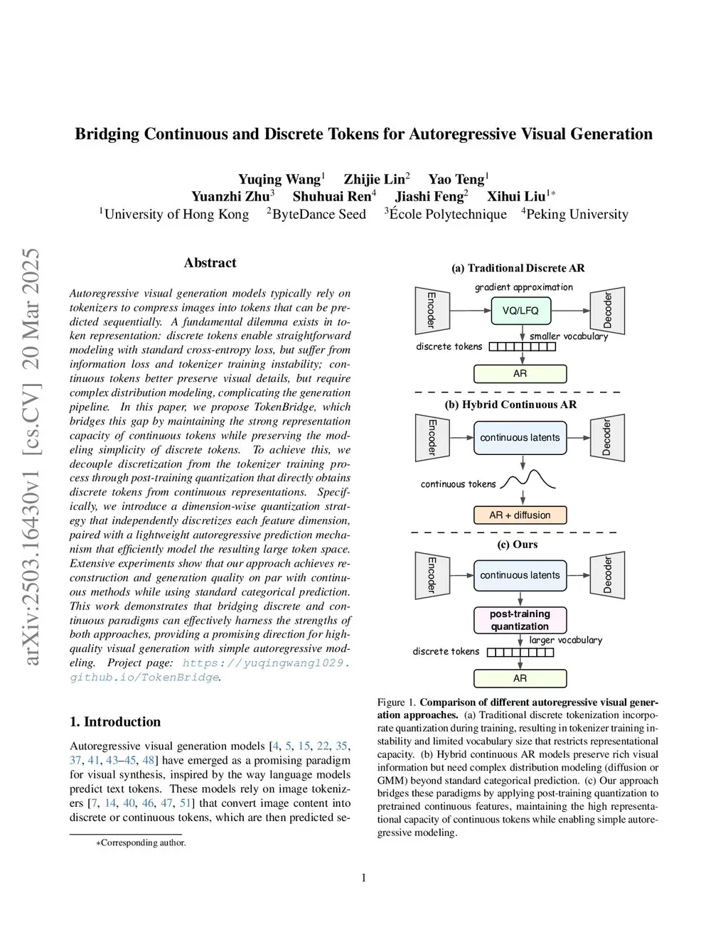 Autoregressive visual generation models typically rely on tokenizers to compress images into tokens that can be predicted sequentially. A fundamental dilemma exists in token representation: discrete tokens enable straightforward modeling with standard cross-entropy loss, but suffer from information loss and tokenizer training instability; continuous tokens better preserve visual details, but require complex distribution modeling, complicating the generation pipeline. In this paper, we propose TokenBridge, which bridges this gap by maintaining the strong representation capacity of continuous tokens while preserving the modeling simplicity of discrete tokens. To achieve this, we decouple discretization from the tokenizer training process through post-training quantization that directly obtains discrete tokens from continuous representations. Specifically, we introduce a dimension-wise quantization strategy that independently discretizes each feature dimension, paired with a lightweight autoregressive prediction mechanism that efficiently model the resulting large token space. Extensive experiments show that our approach achieves reconstruction and generation quality on par with continuous methods while using standard categorical prediction. This work demonstrates that bridging discrete and continuous paradigms can effectively harness the strengths of both approaches, providing a promising direction for high-quality visual generation with simple autoregressive modeling. Project page:this https URL.